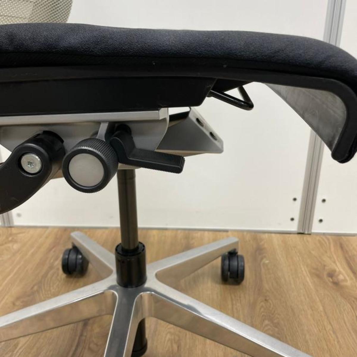 快適な座り心地に不可欠な調節機能である、上下昇降、座面の奥行き調整、リクライニングなどを備えており、操作もわかりやすく好評です。 特に、座面の奥行きは、座面下の左右に通った細いバーで調整でき、座ったままで軽やかに滑るように調整が可能です。 価格面では、新品では高めですが、中古は流通も多く、定価の3割前後の価格で高級チェアの座り心地を手に入れることができます!
