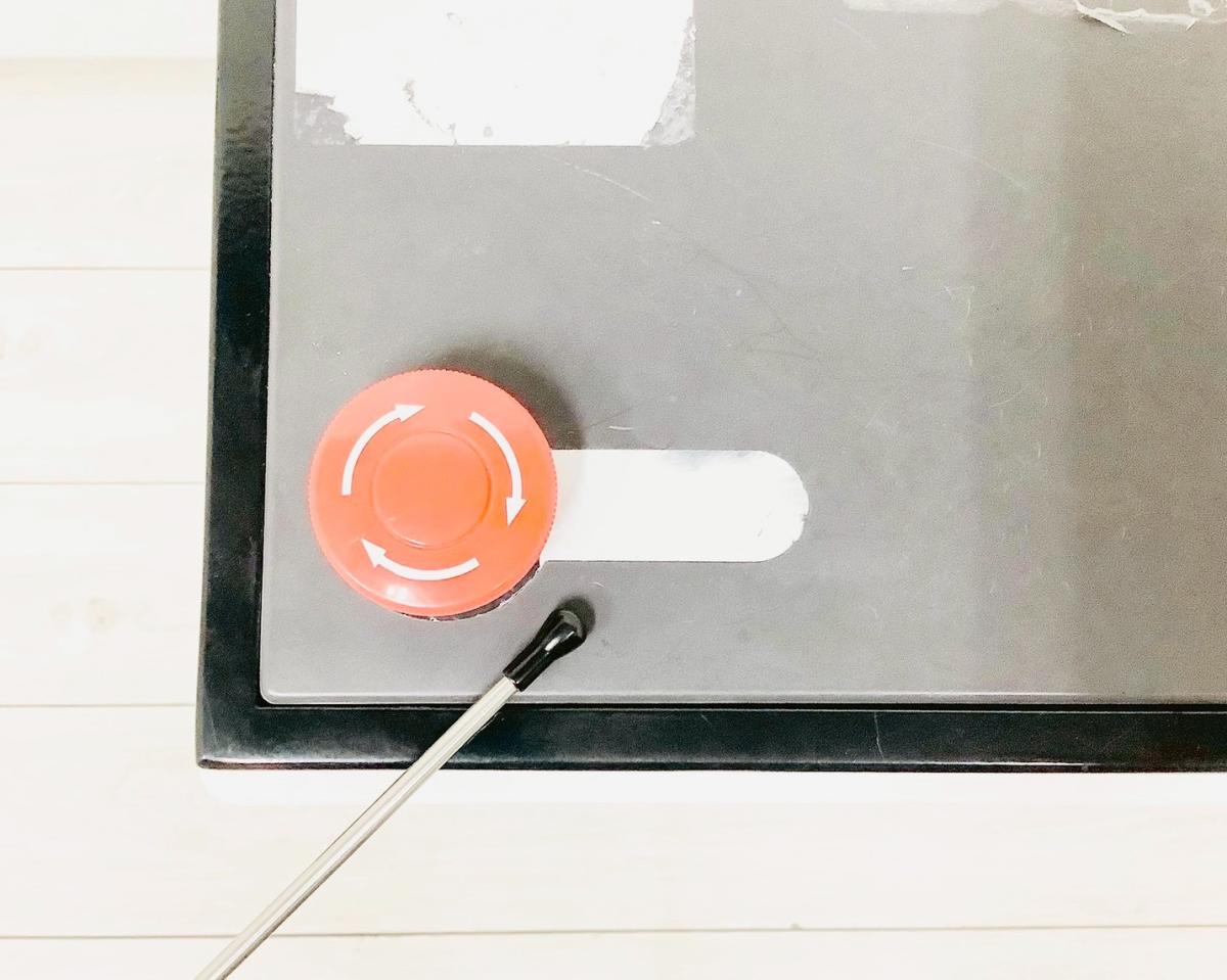 スイッチを押すと緊急停止し、スイッチを右に回転させると元に戻ります。