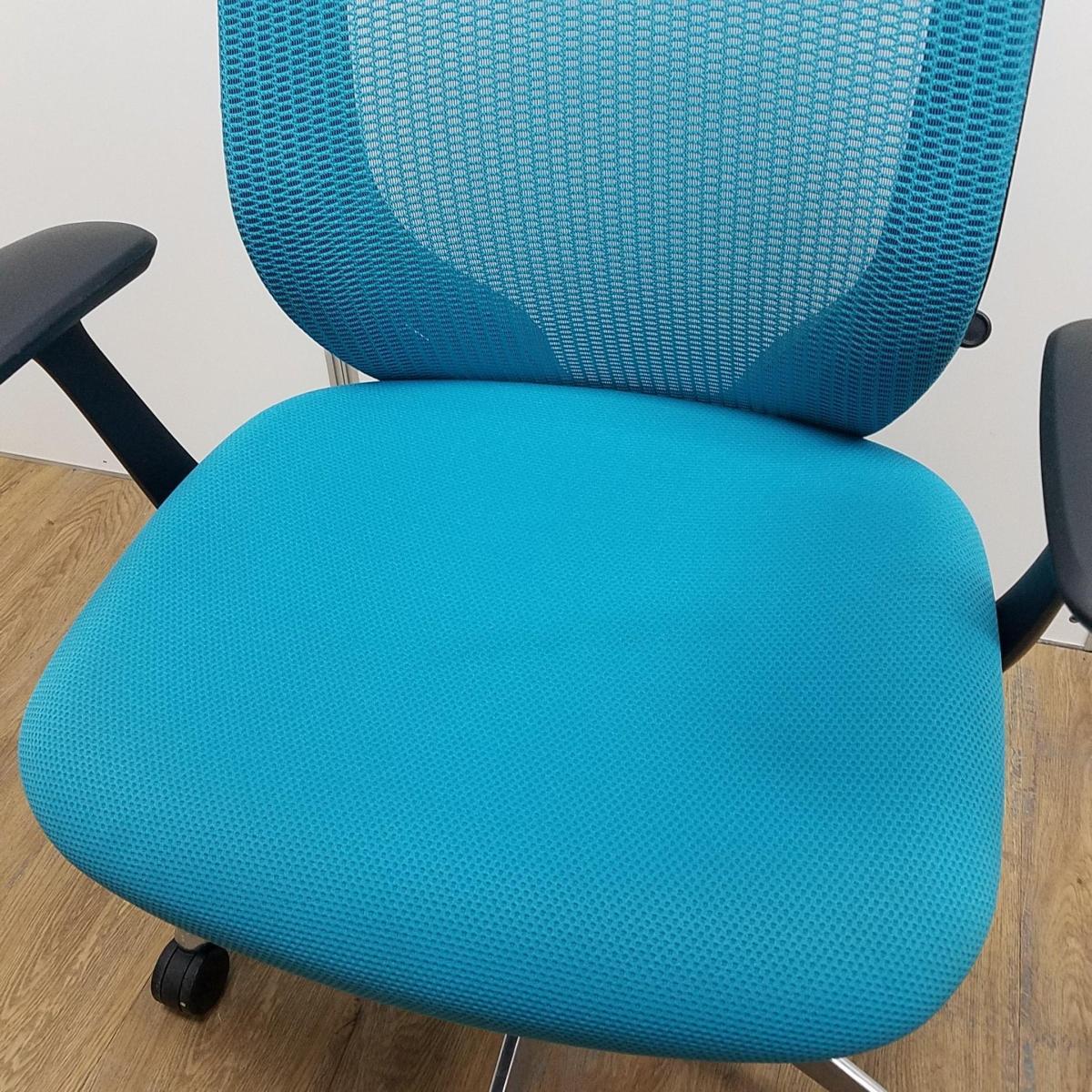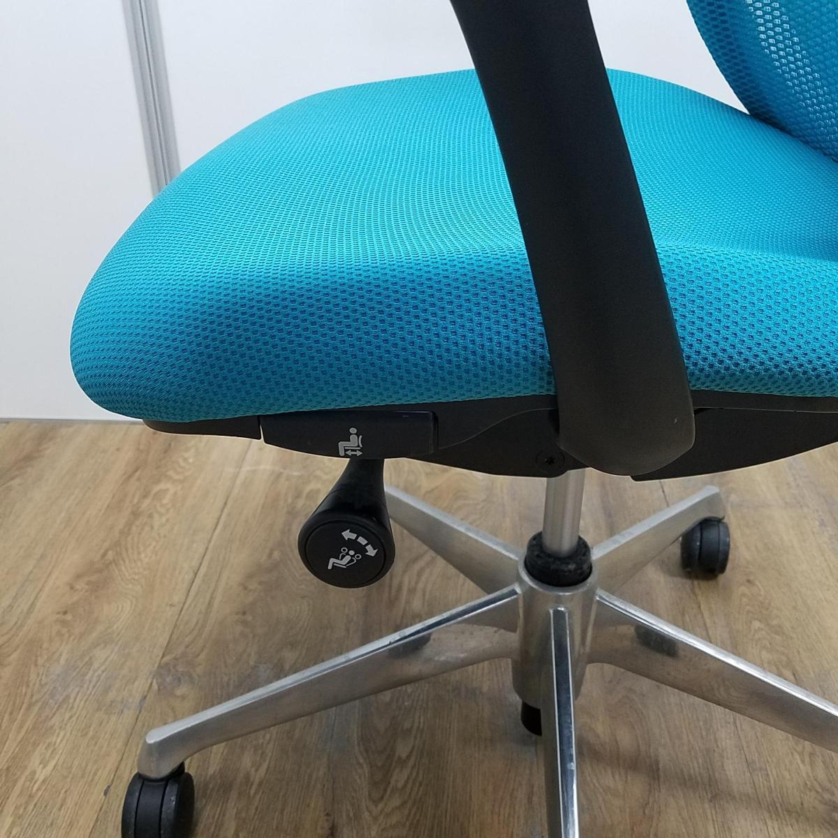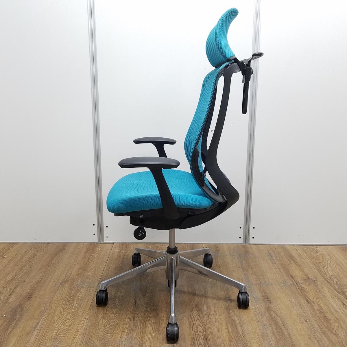 オカムラ製 シルフィーシリーズ ブルーグリーン コートハンガー ヘッドレスト ポリッシュ脚 アジャストアーム※可動肘 肘付きハイバックチチェア!!- 大阪・堺店