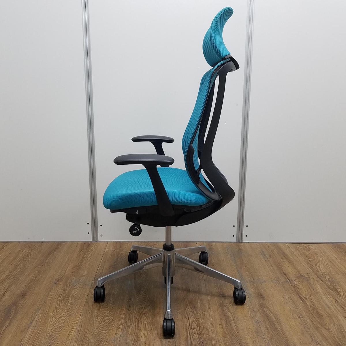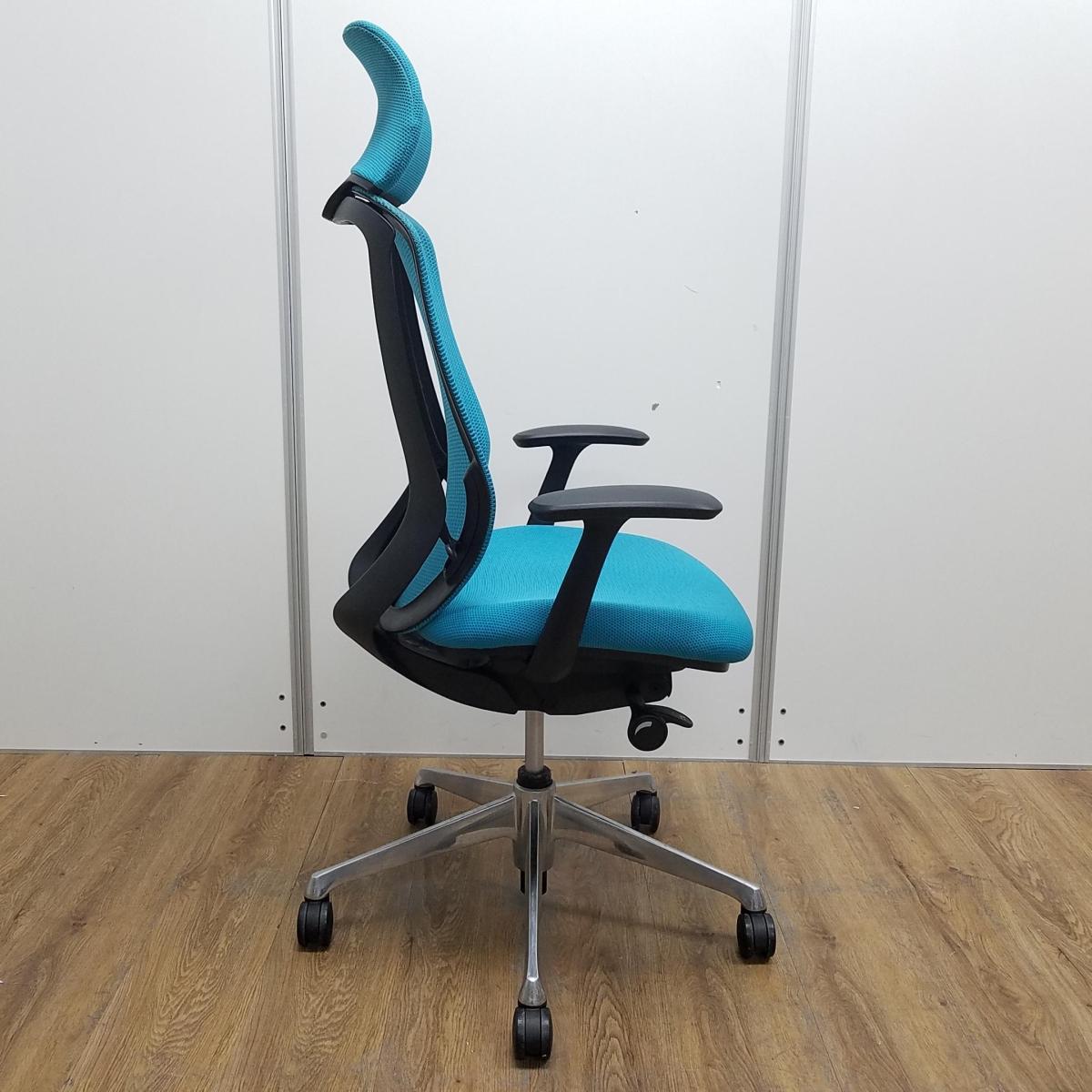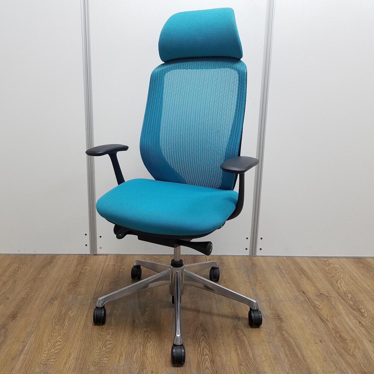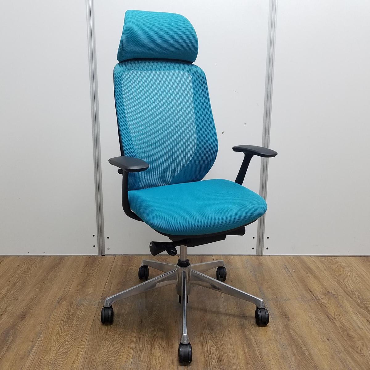 オカムラ製 シルフィーシリーズ ブルーグリーン ヘッドレスト ポリッシュ脚 デザインアーム※固定肘 肘付きハイバックチチェア!!- 大阪・堺店