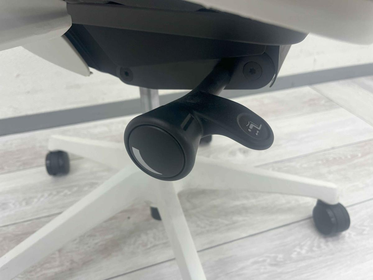 - 座面右下のダイヤル操作で、リクライニングの強弱調整が行えます。これまでのダイヤル式よりも、少ない回転数で、最弱?最強の調整が可能です。