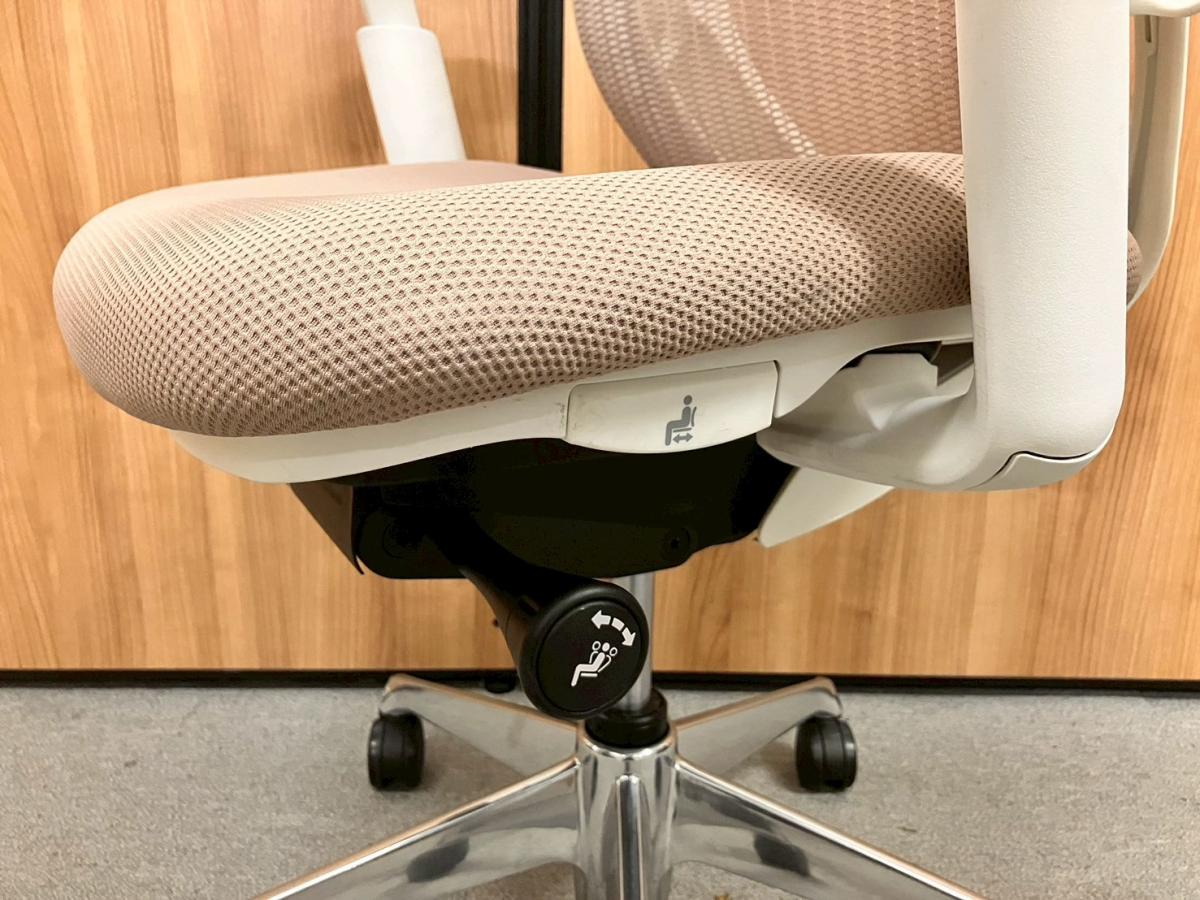 - 座面の左にあるレバー操作により、座面の奥行き調整が可能です。(ストローク:50mm)