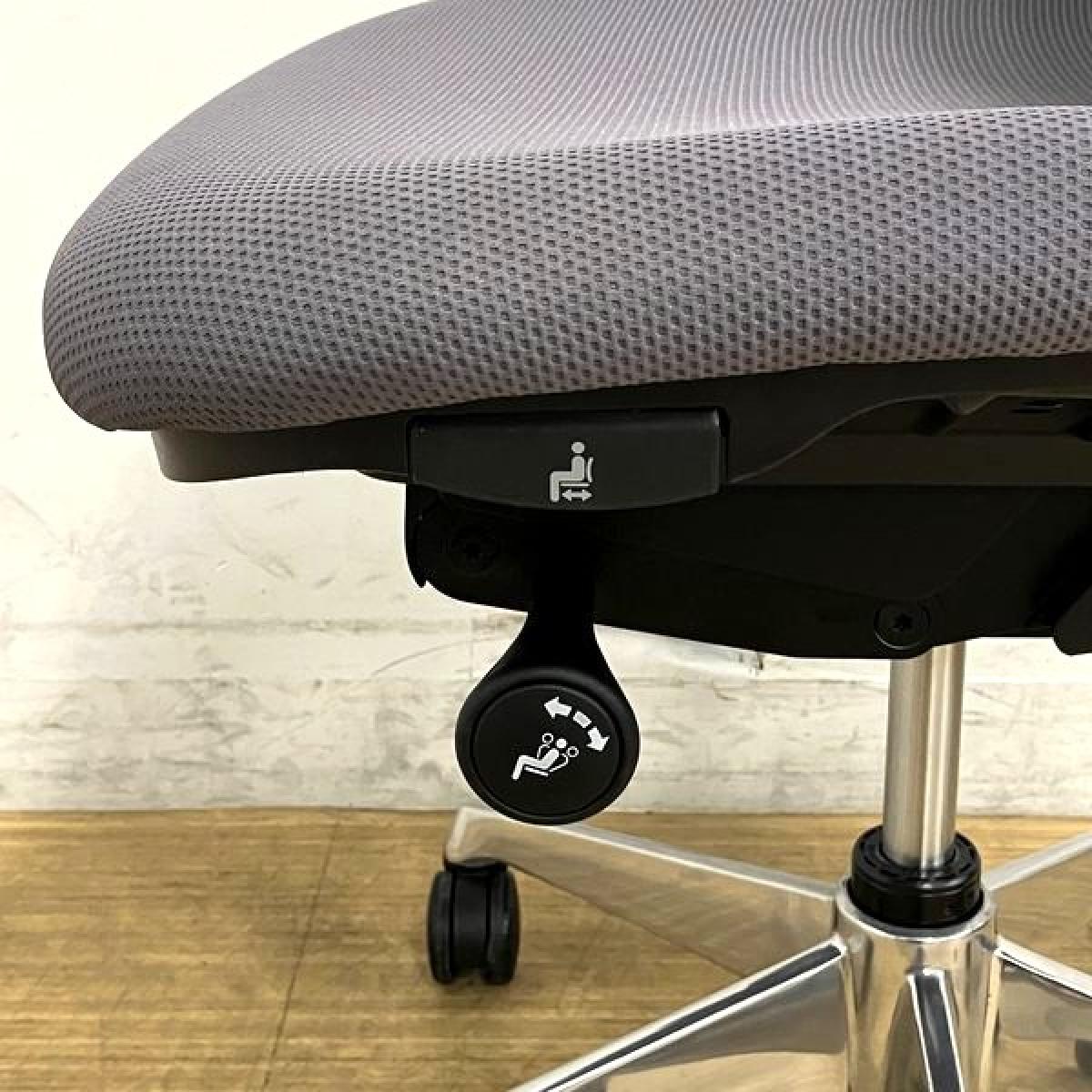 - 座面右下のダイヤル操作で、リクライニングの強弱調整が行えます。これまでのダイヤル式よりも、少ない回転数で、最弱?最強の調整が可能です。