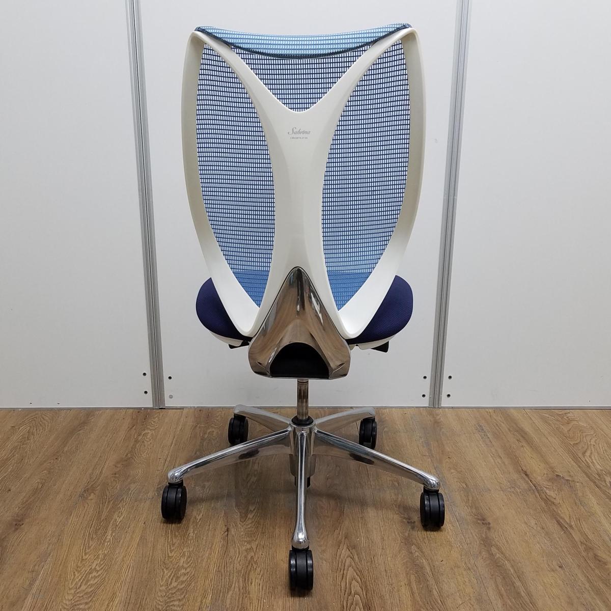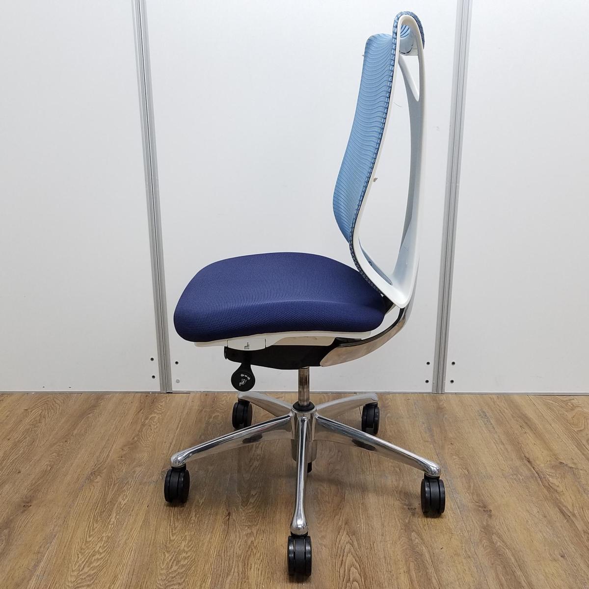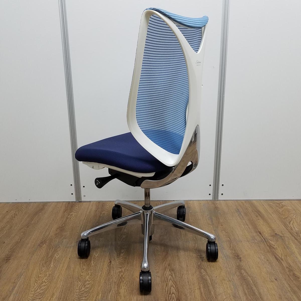 オカムラ製 サブリナシリーズ アクアブルー 背もたれ/アクアブルーx座面/ダークブルーのツートンカラー ホワイトフレーム 前傾チルト付 流れるような美しいフォルムの最高級メッシュチェア! 肘無しハイバックチェア!!- 京都東寺店