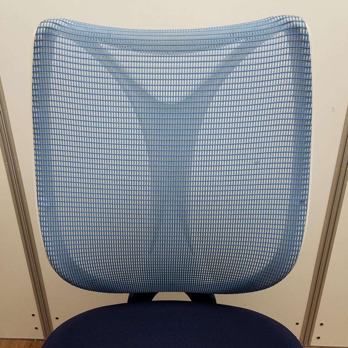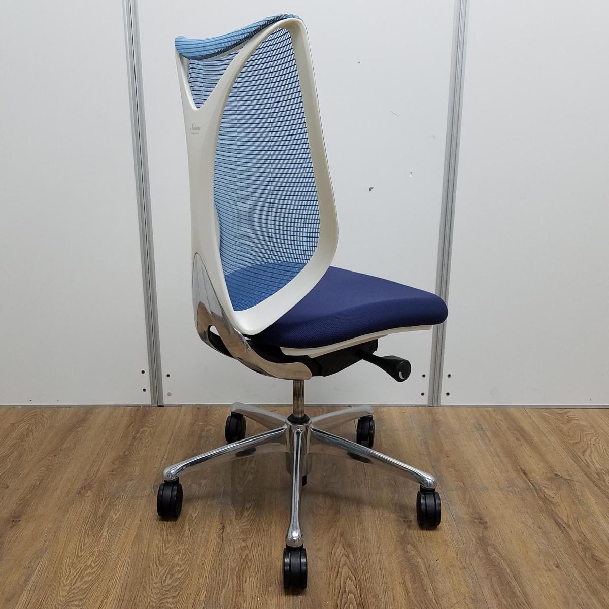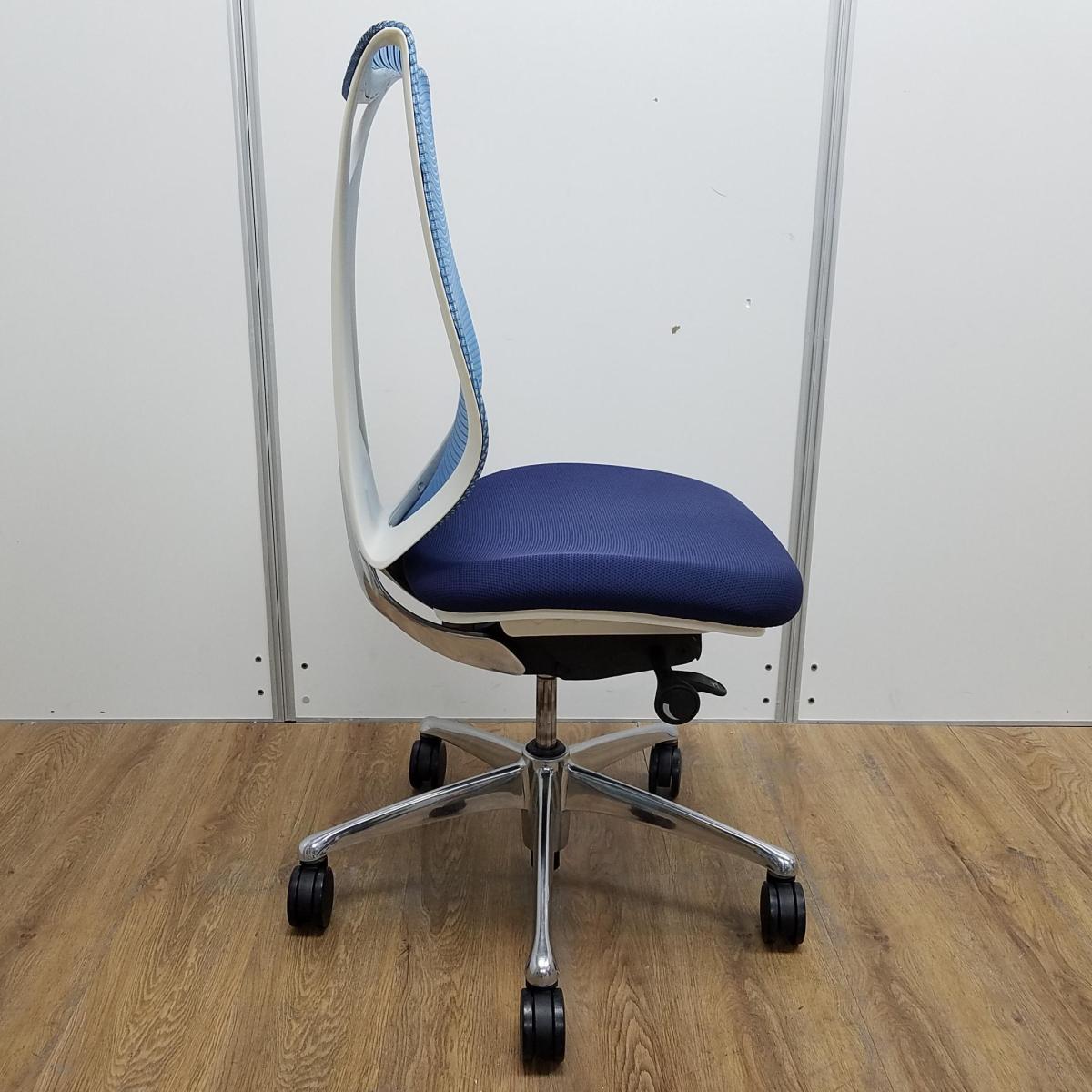 オカムラ製 サブリナシリーズ アクアブルー 背もたれ/アクアブルーx座面/ダークブルーのツートンカラー ホワイトフレーム 前傾チルト付 流れるような美しいフォルムの最高級メッシュチェア! 肘無しハイバックチェア!!- 京都東寺店
