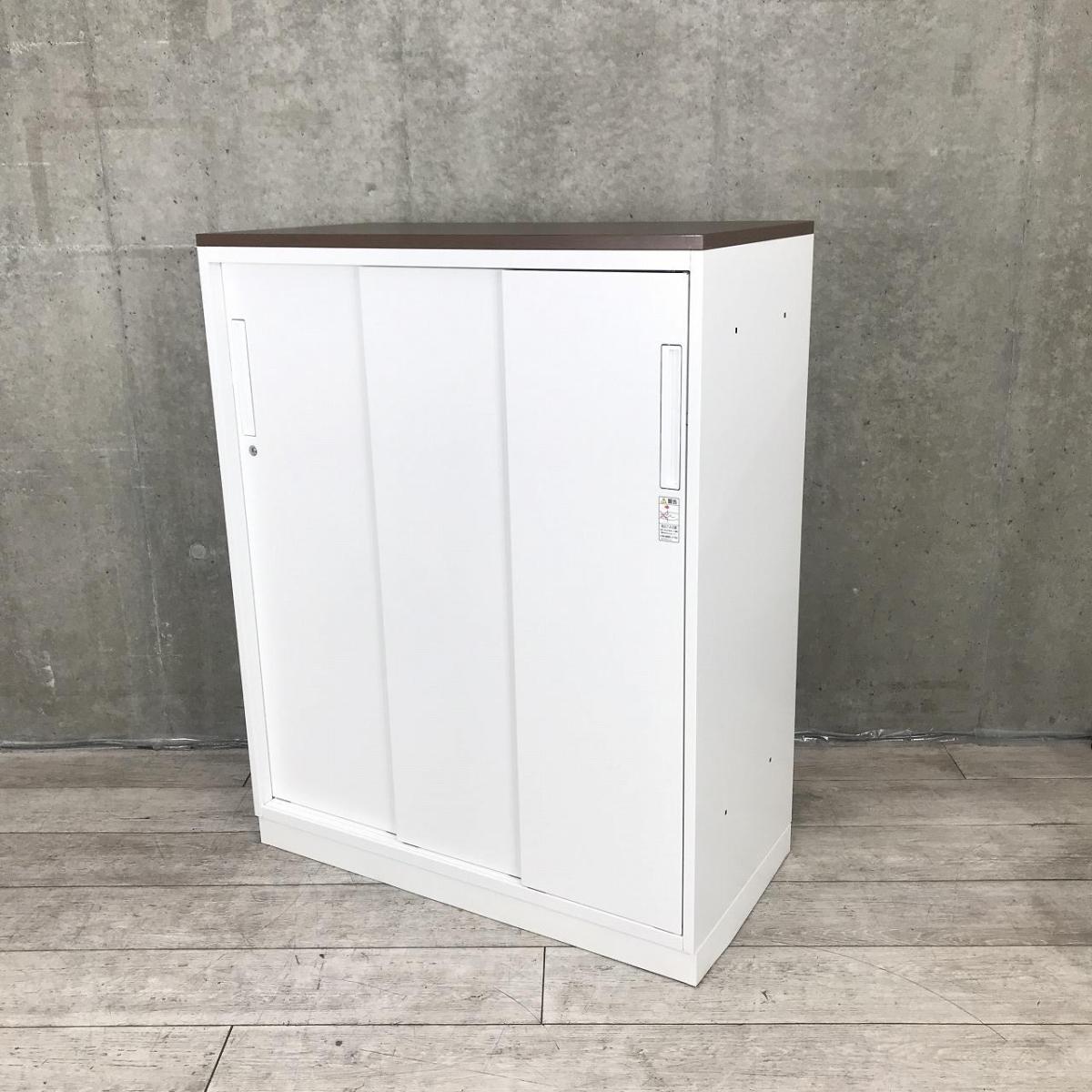【スライド引き戸だから開閉スペースに困りません!取っ手が大きく開閉しやすい!】■コクヨ(KOKUYO)製 エディア(EDIA) 3枚引き違い書庫 ローキャビネット ■シリンダー錠 ■ブラウン木目調天板付き ■ホワイト- 千葉店