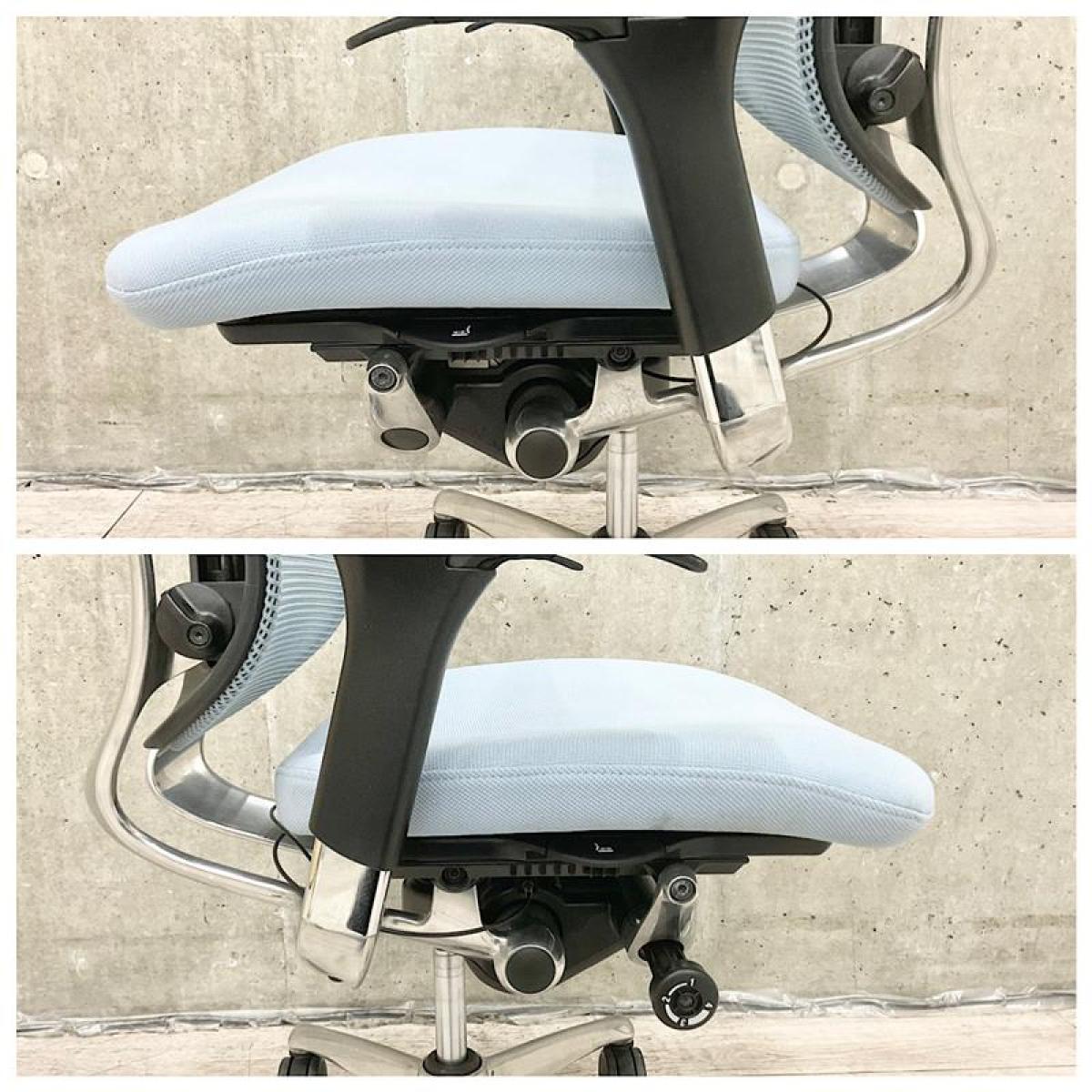 【K9】【商品入替のため、残り7脚限り】【座面に使用感の汚れあり】オカムラ製 コンテッサシリーズ ライトブルー 背面メッシュ ランバーサポート付 可動肘 世界で認められた革新的タスクチェア! 人間工学に基づいた快適な座り心地を実現! 肘付きハイバックチェア!!