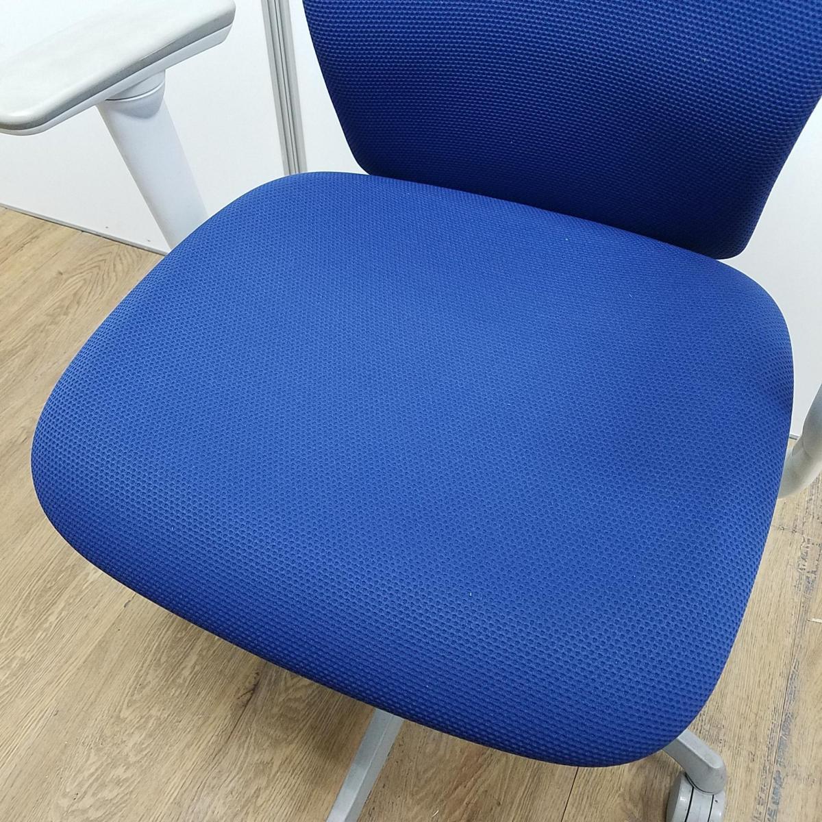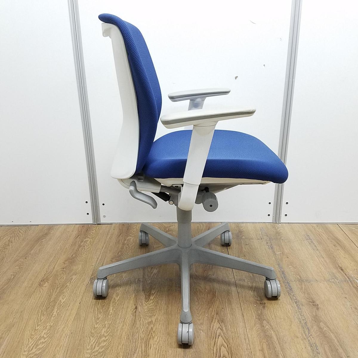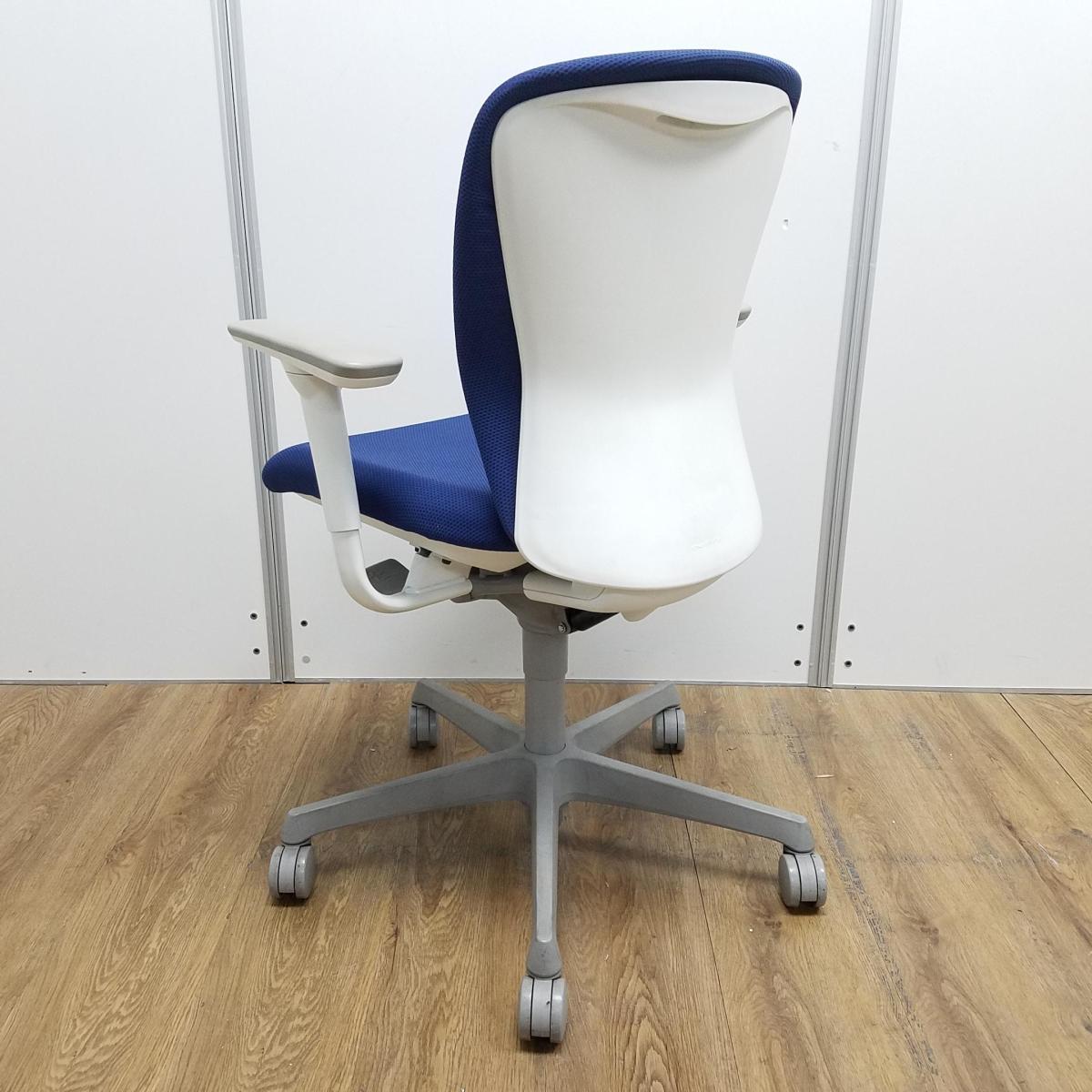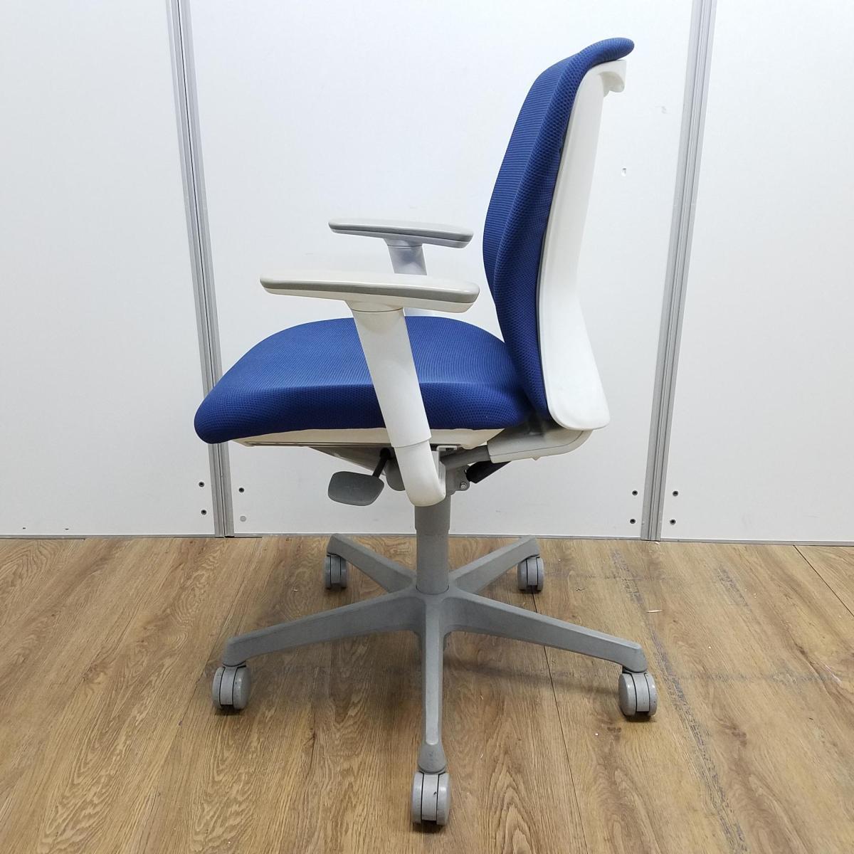 オカムラ製 スラートシリーズ ミディアムブルー ホワイトフレーム アジャストアーム※可動肘 樹脂脚 肘付きローバックチェア!【A】- 神戸・三宮店
