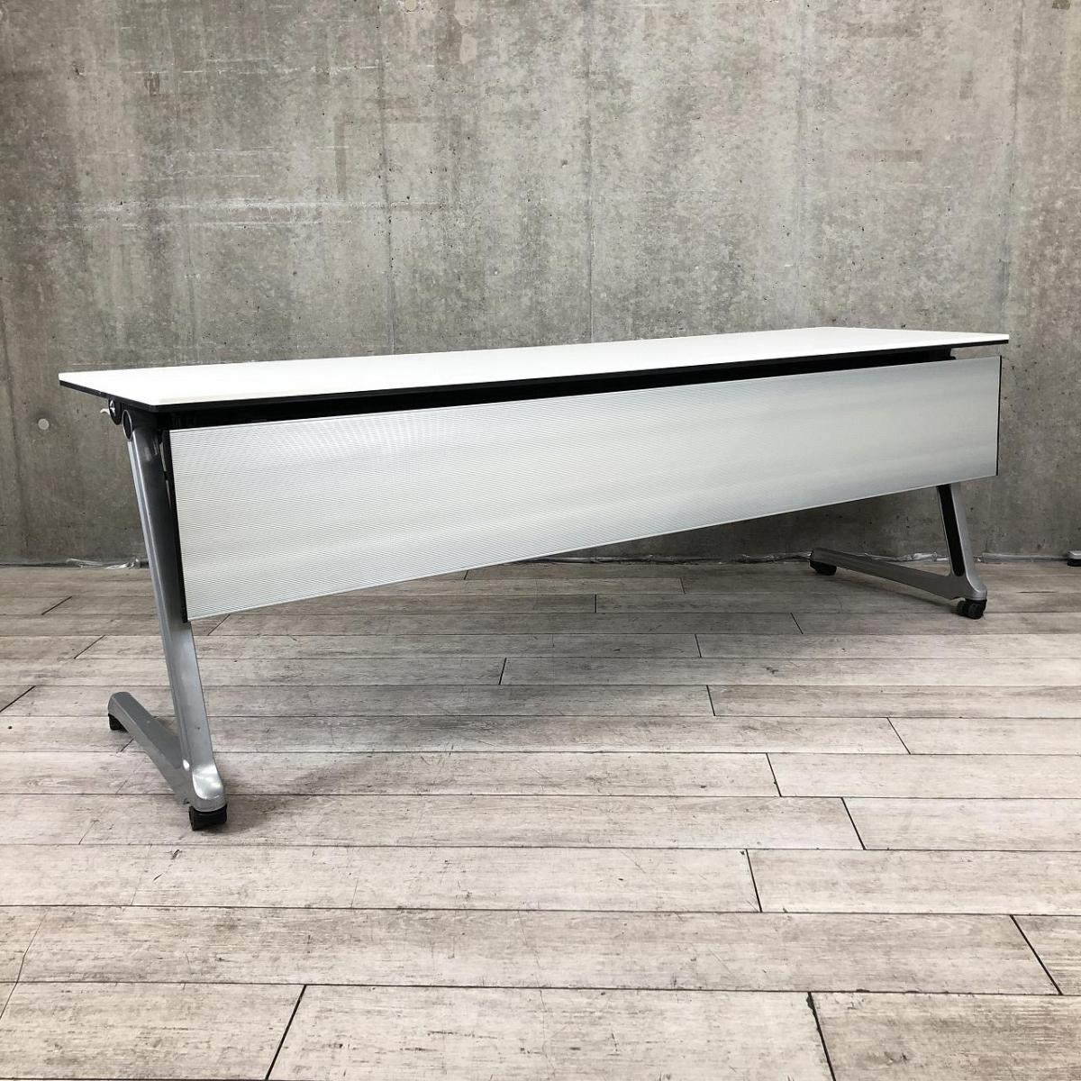 【折りたたみ収納が秀逸!スタイリッシュなデザイン!】■オカムラ(okamura)製 インターアクトPRO サイドスタックテーブル 幅2100mm ■幕板パネル付 ■ホワイト- 大阪・堺店