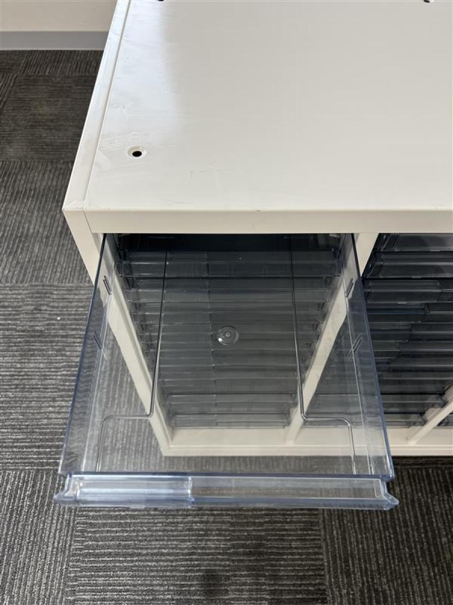 【書類・備品整理の必需品!書類や備品のストックにピッタリ!※1段目のみ浅型仕様】オカムラ レクトライン クリスタルトレー 書類 引き出し 透明 ケース ローキャビネット 整理 中古家具 オフィス家具 福岡 九州最大級《オフィスバスターズ福岡博多店は、福岡を拠点として、日本全国へ中古オフィス用品・オフィス家具を提供しております》