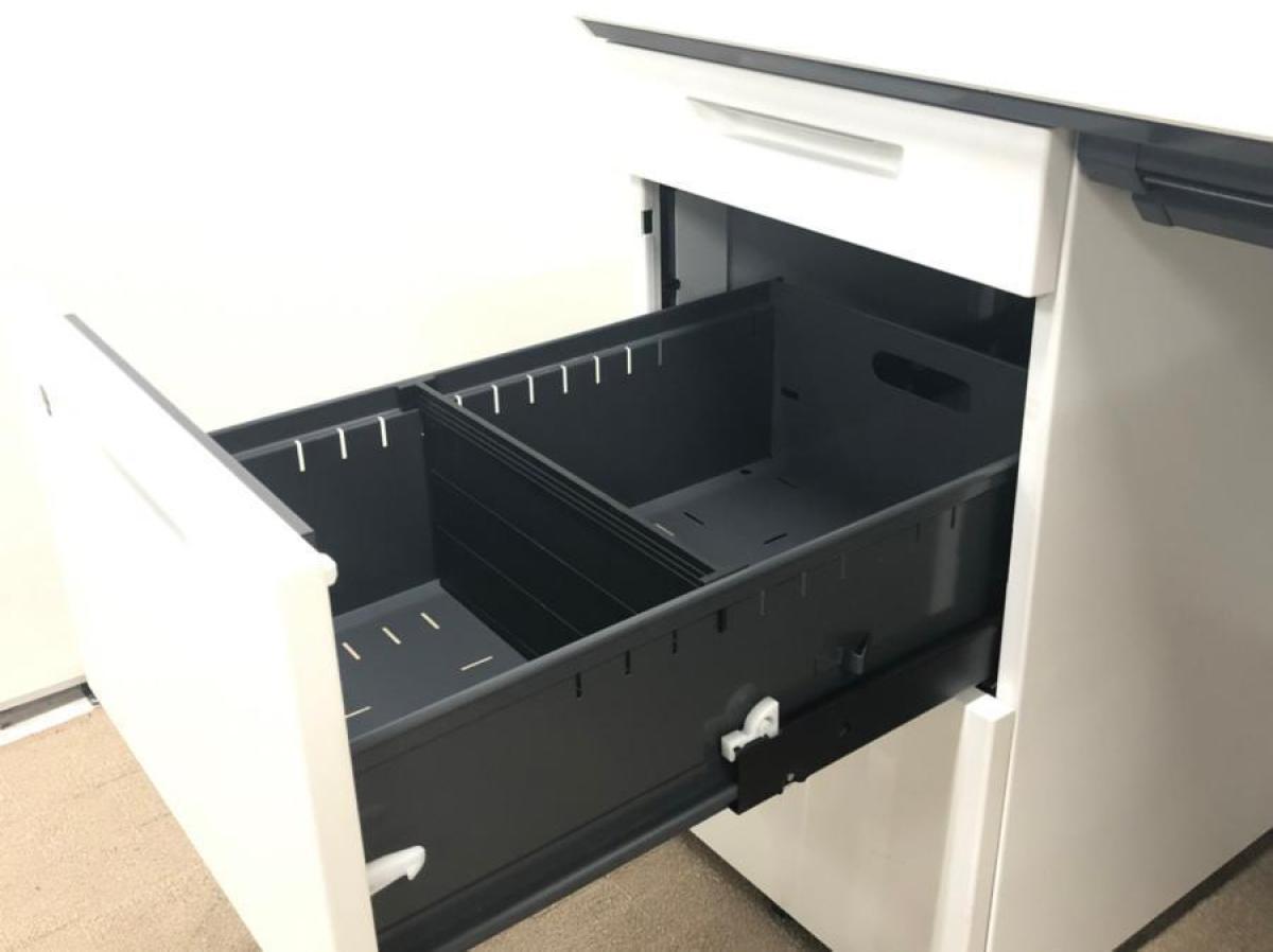 - 地震時、センター引出しが飛び出さないよう、ラッチ機構を装備。脚はデスクの横ズレを軽減させる設計になっています。