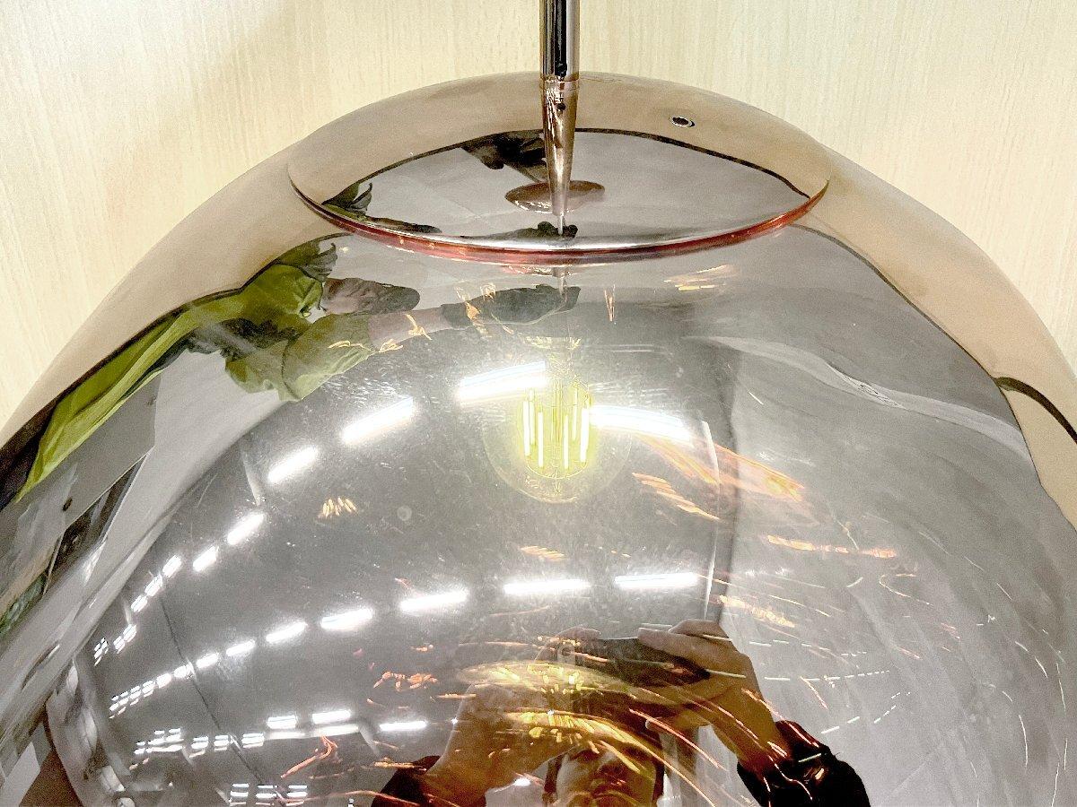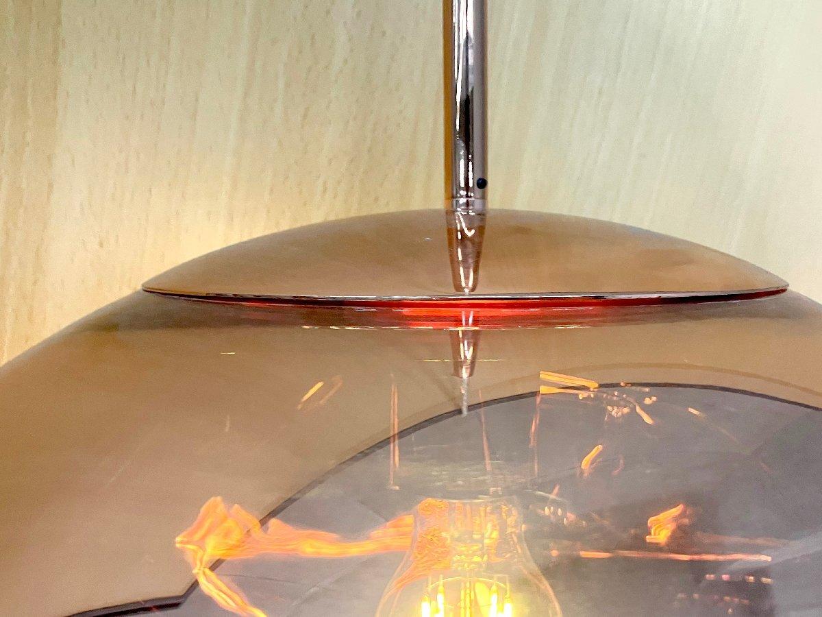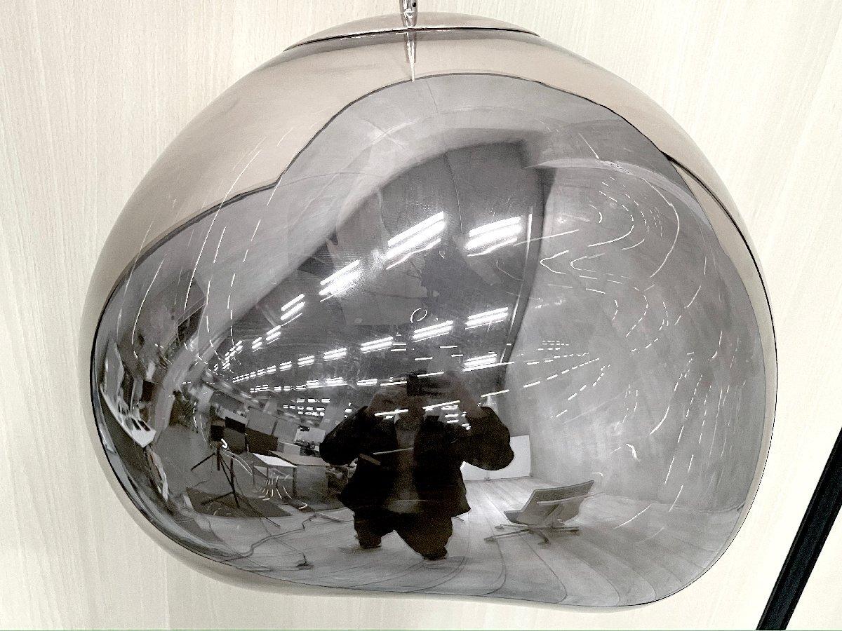 シェードはポリカーボネート製で、消灯時には鏡面加工された金属のように周囲を写し込み、点灯するとガラスのように透き通り柔らかな光が溢れるメタライズ加工が施されています。その姿はまるで固体が液体へと溶け出していくような錯覚を感じさせる独特なもので、空間に非日常的系な美しさを演出してくれます。