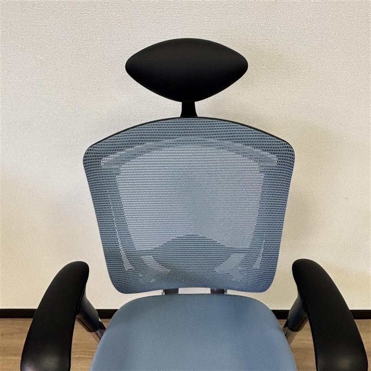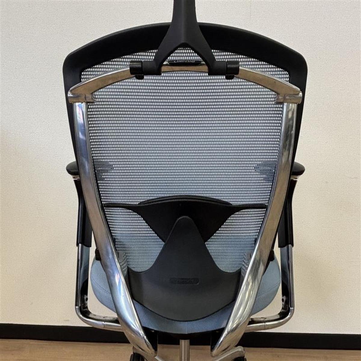 【K9】【商品入替のため、残り7脚限り】【座面に使用感の汚れあり】オカムラ製 コンテッサシリーズ ライトブルー 背面メッシュ ランバーサポート付 可動肘 世界で認められた革新的タスクチェア! 人間工学に基づいた快適な座り心地を実現! 肘付きハイバックチェア!!