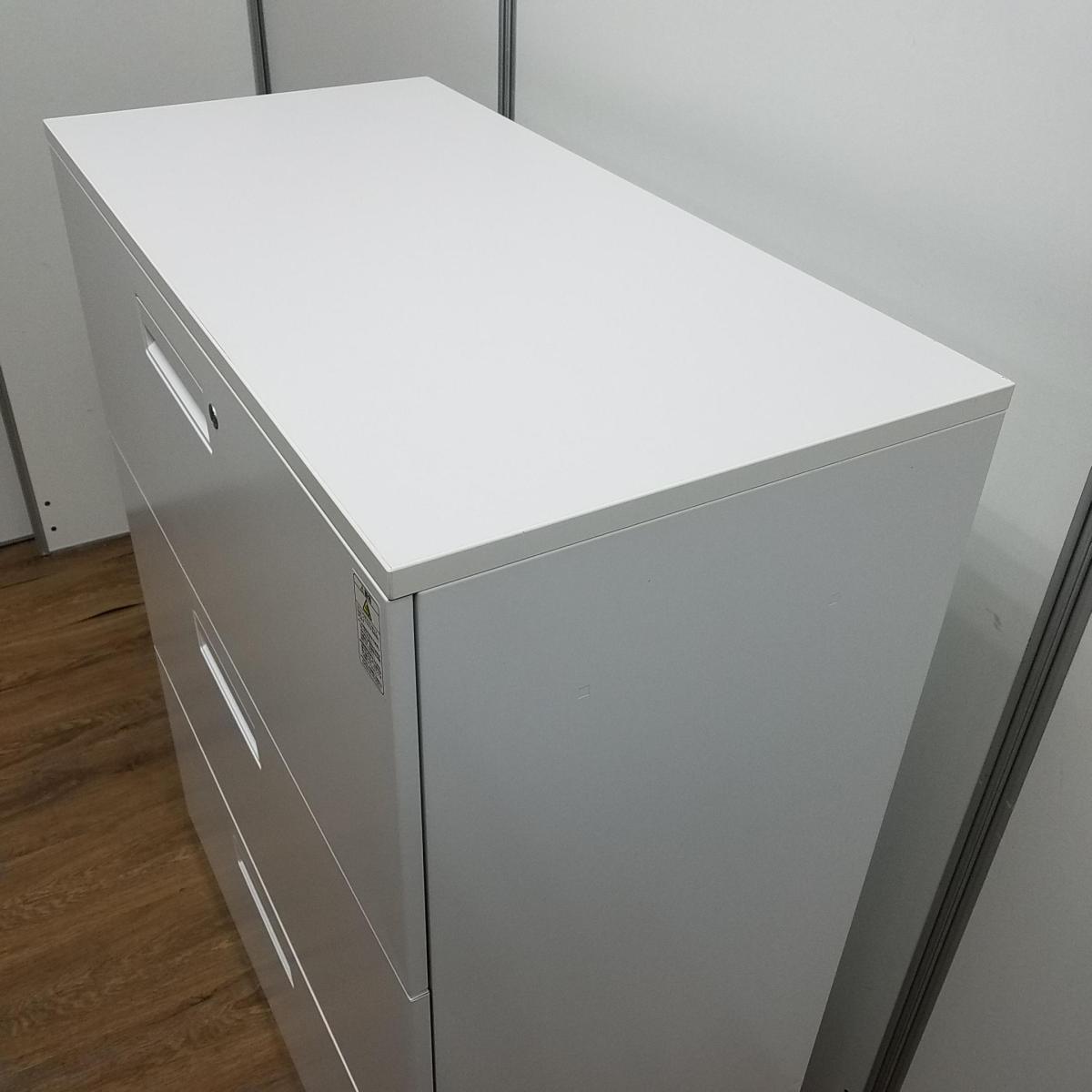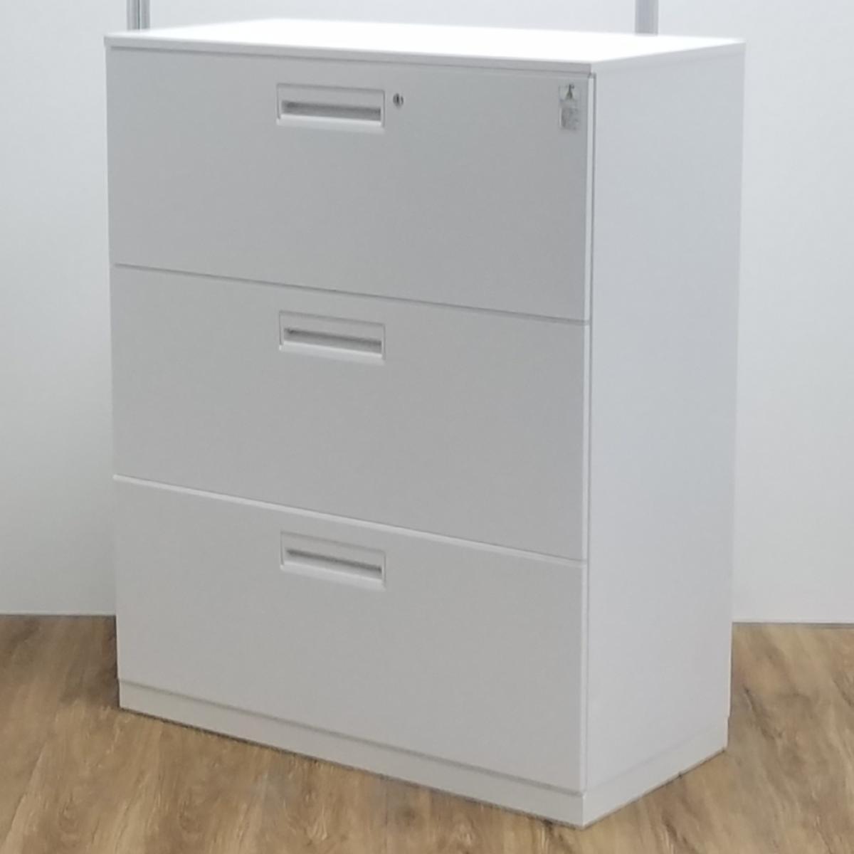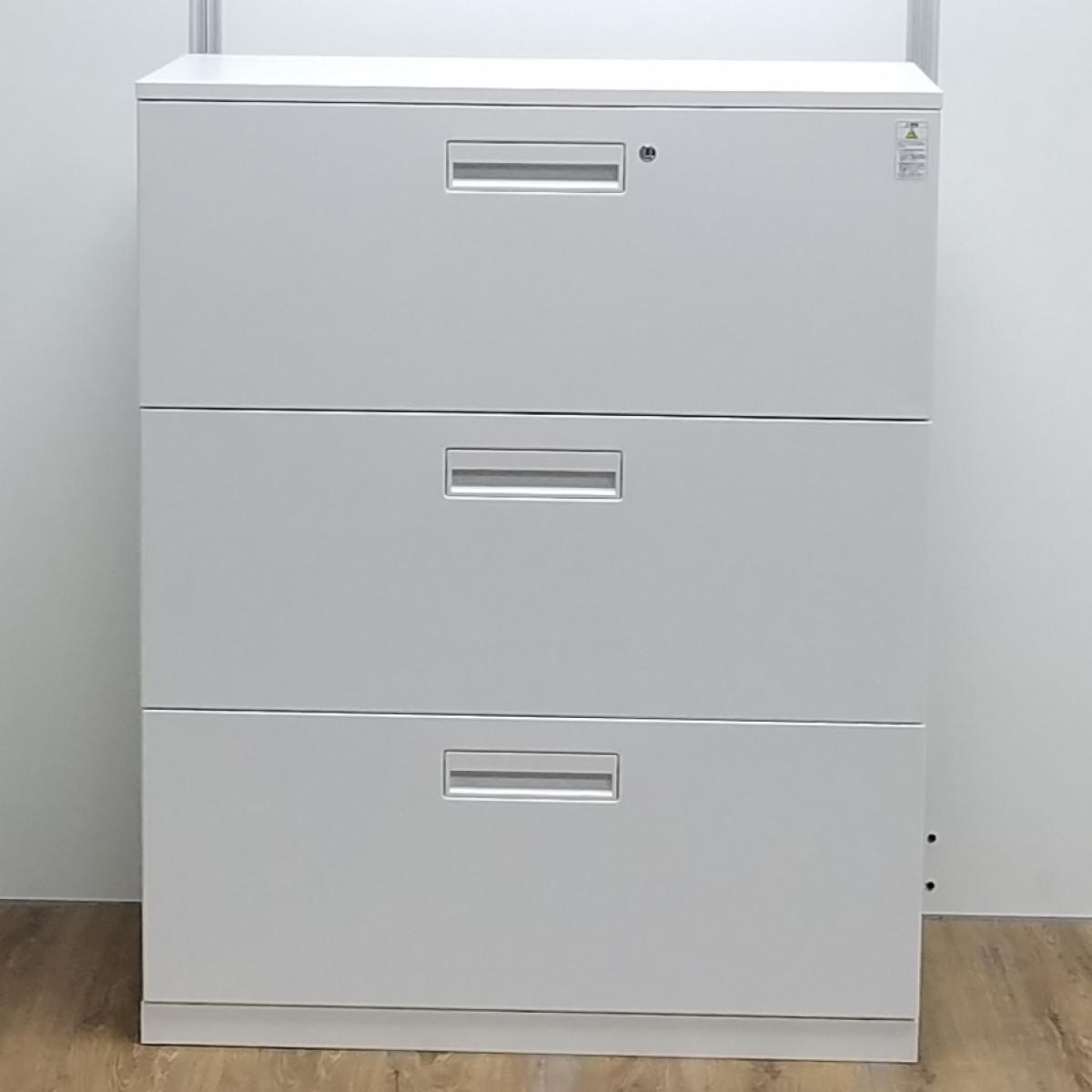 【商品入替のため、残り1台限り】【下段凹みキズあり】コクヨ製 エディアシリーズ ホワイト シリンダー ホワイト天板 ローキャビネット キングファイル収納におすすめ! オフィスの書類をスッキリ整理! スリムでシャープなデザインの書庫! 3段ラテラル書庫!!- 京都東寺店