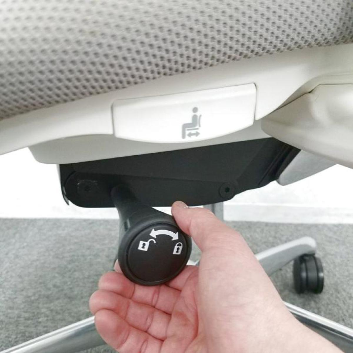 座面の奥行きは、座面左下のレバーで前後50mmスライド調節可能が可能です。