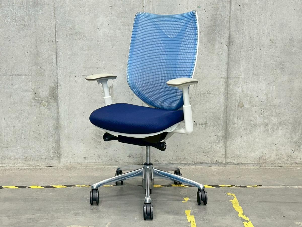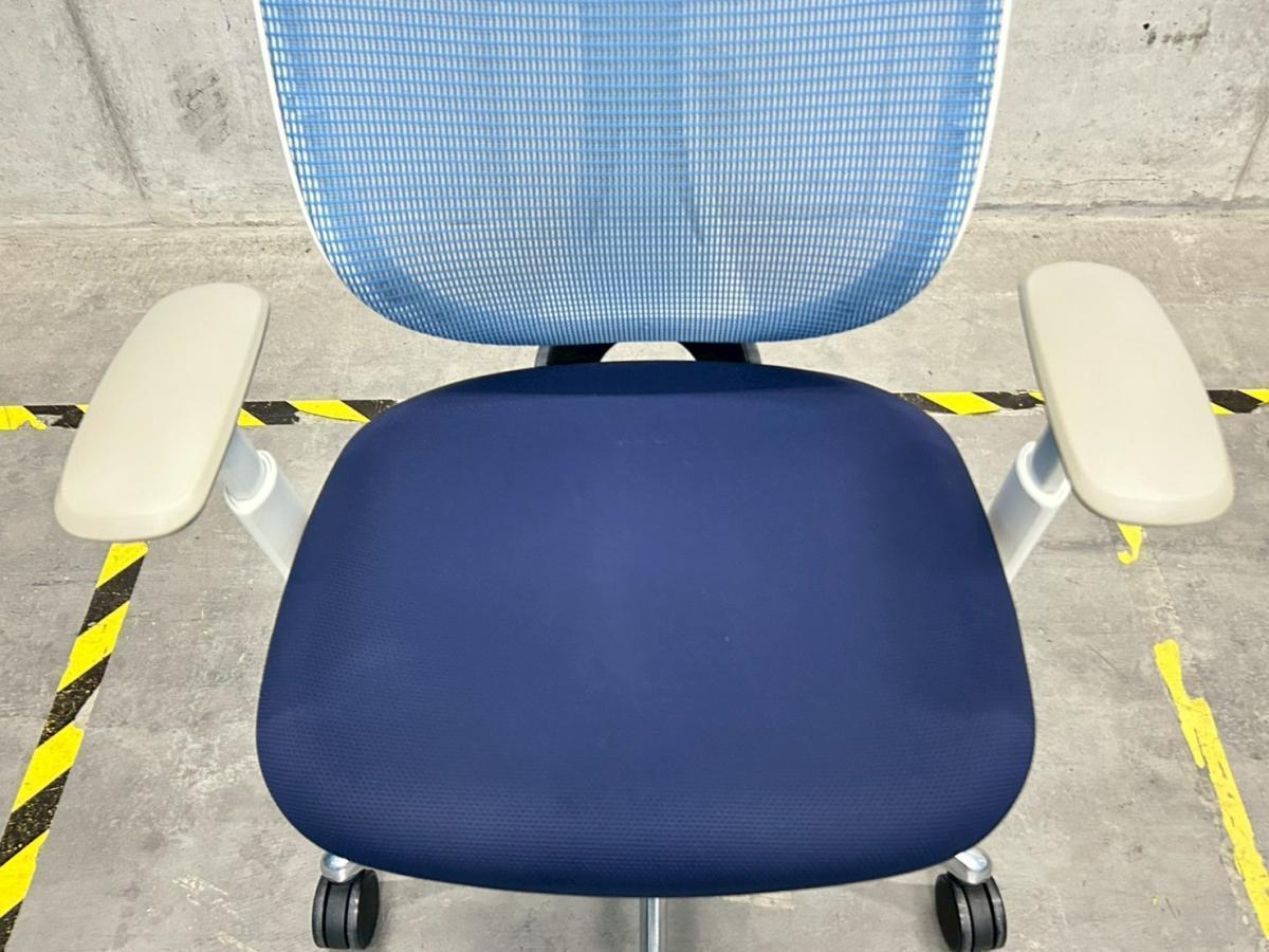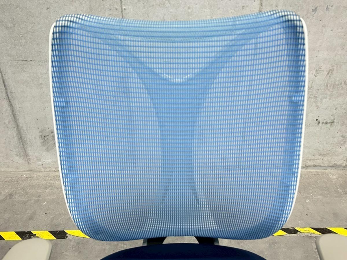 【移硬度クッションと前傾機能付きで腰に優しい!】■オカムラ(okamura)製 Sabrina(サブリナ) ハイバック 肘付き ■背面メッシュ ■可動肘 ■背アクアブルー × 座ダークブルー × ホワイトシェル ※サテライト店舗倉庫撮影画像※【管理番号:A01014865】【ID】サーキュラーバリューCO2削減量の算出について
