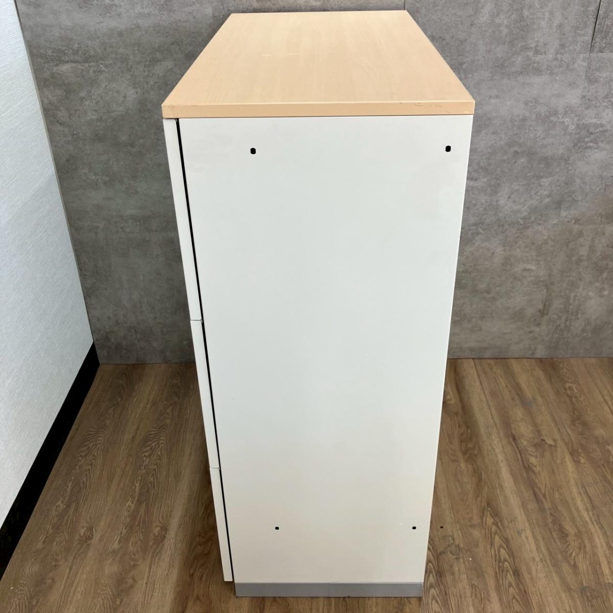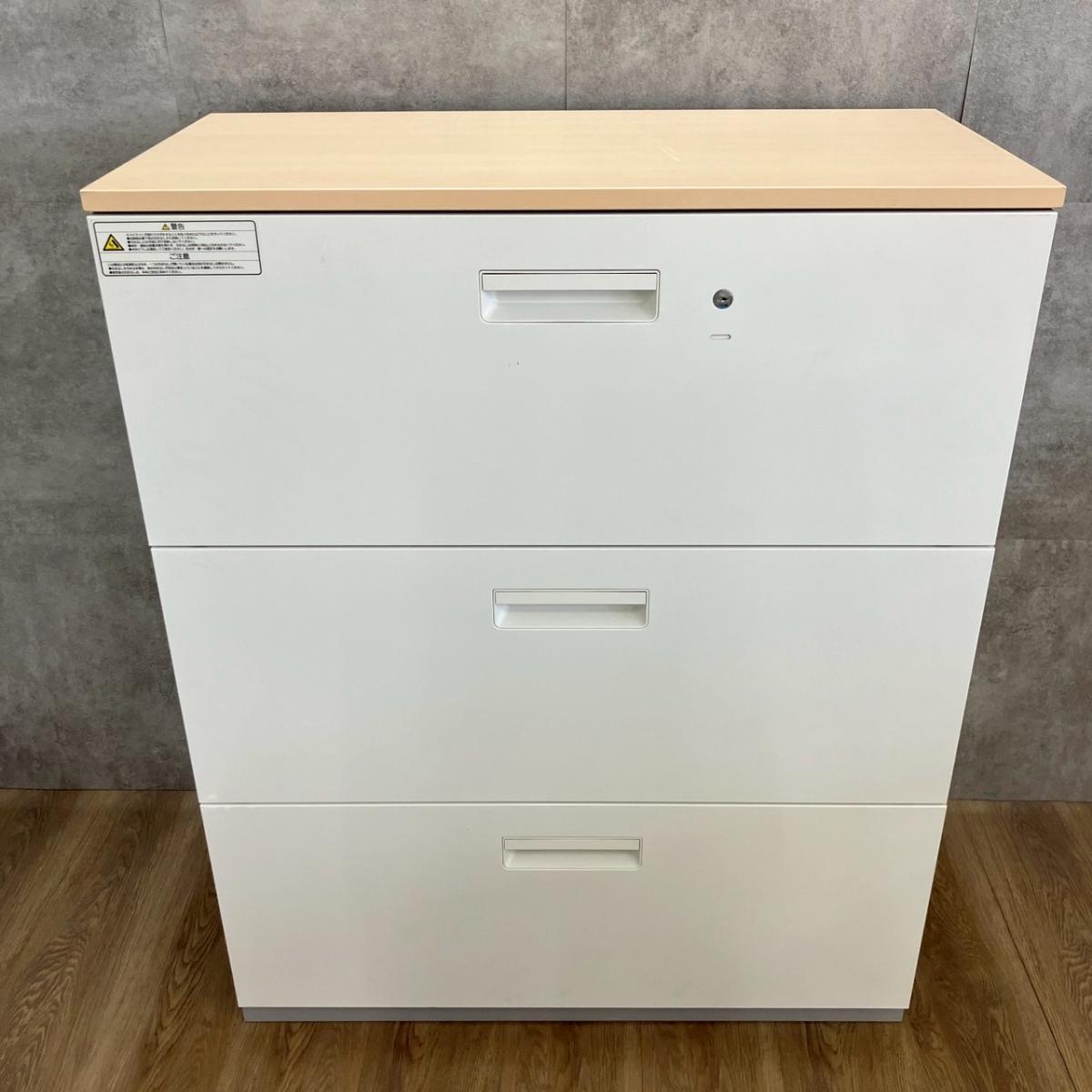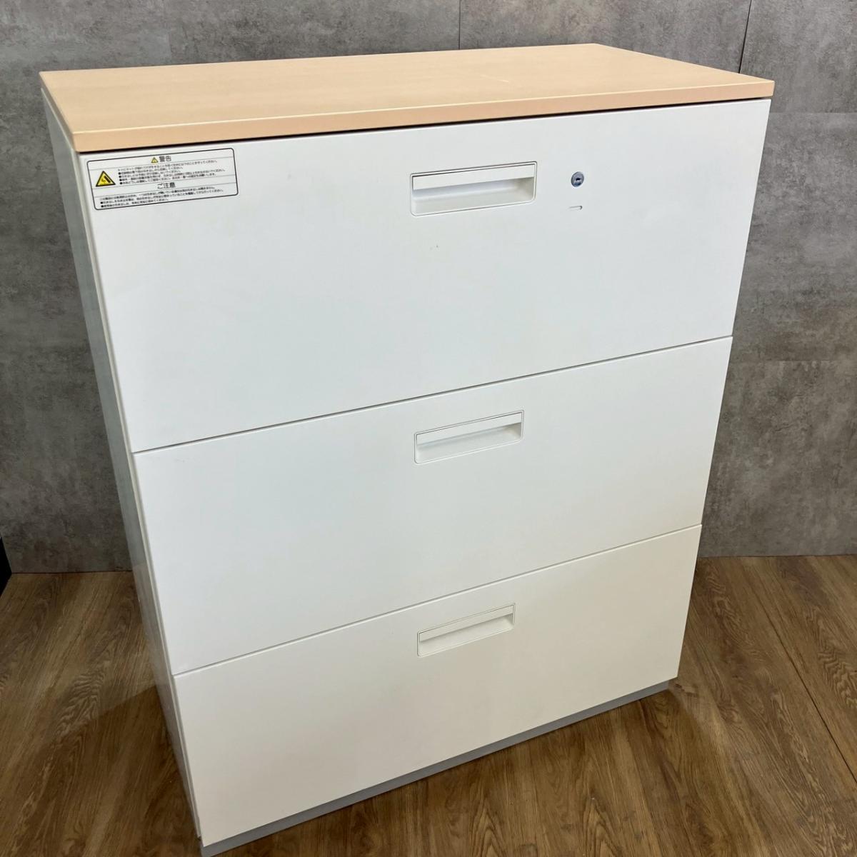 【ナチュラル調天板が人気の引き出し式書庫!】■プラス(PLUS)製 L6シリーズ 3段ラテラル ローキャビネット W900×D450㎜ ■ホワイト ■ナチュラル木目調天板付き ■シリンダー錠