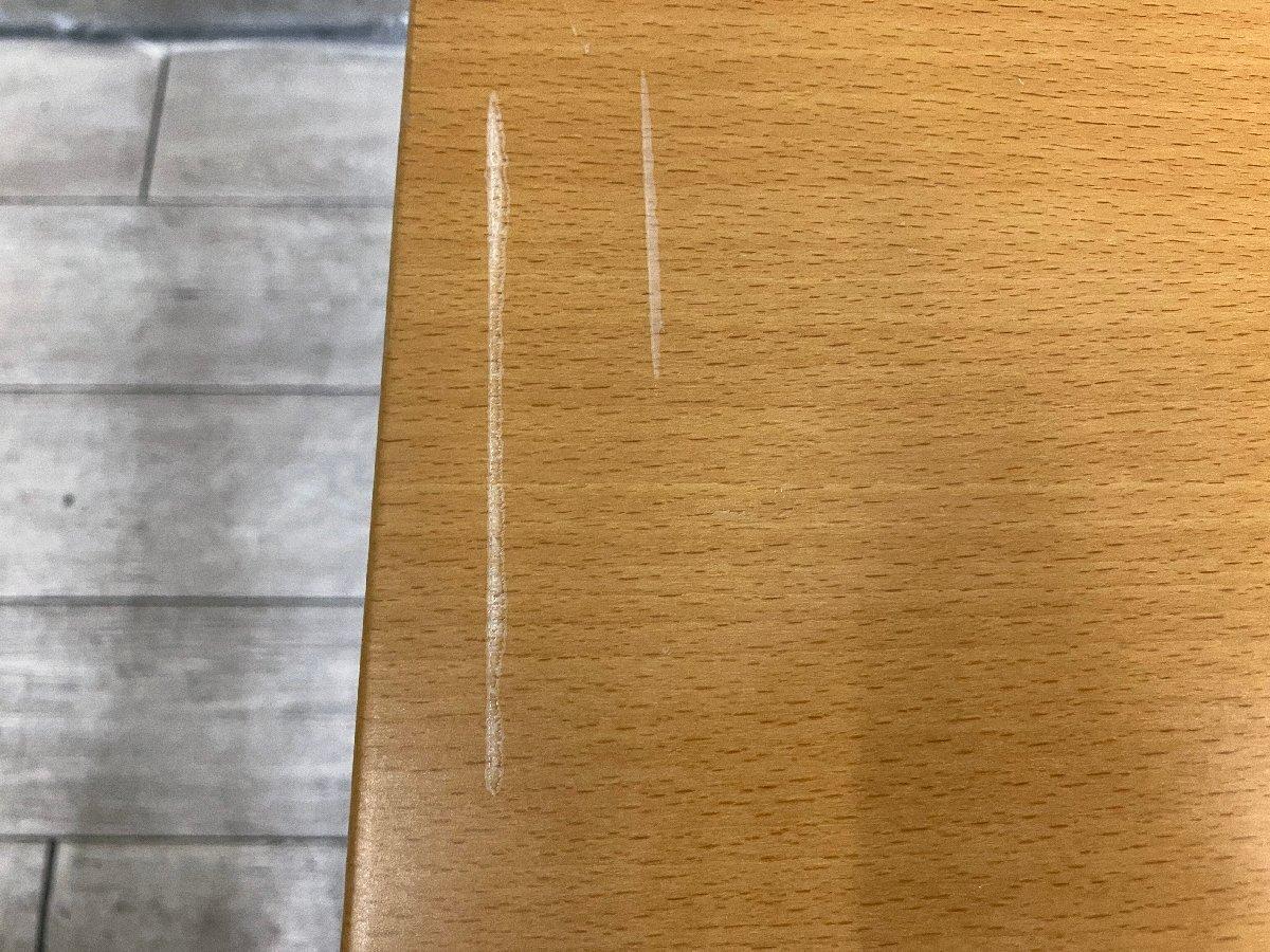 - 目立つ箇所あり傷・凹みが多数、深い傷・凹みが一部ある。(例、天板、幕板、棚板、サイド部分、脚部等にある。)