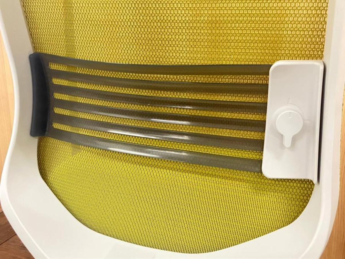 背もたれがメッシュのチェアは、構造上、外枠となるフレームが存在します。小さめのメッシュチェアは背中にフレームが当たったり、メッシュの弾性を十分に得ることができないので、一般にメッシュチェアは大型になりがちです。しかし、シロッコチェアは、フレームを横ではなく縦方向に厚くしたバーチカルフレームで強度を確保しており、 小さめのボディでありながらメッシュ面が広く作られています。