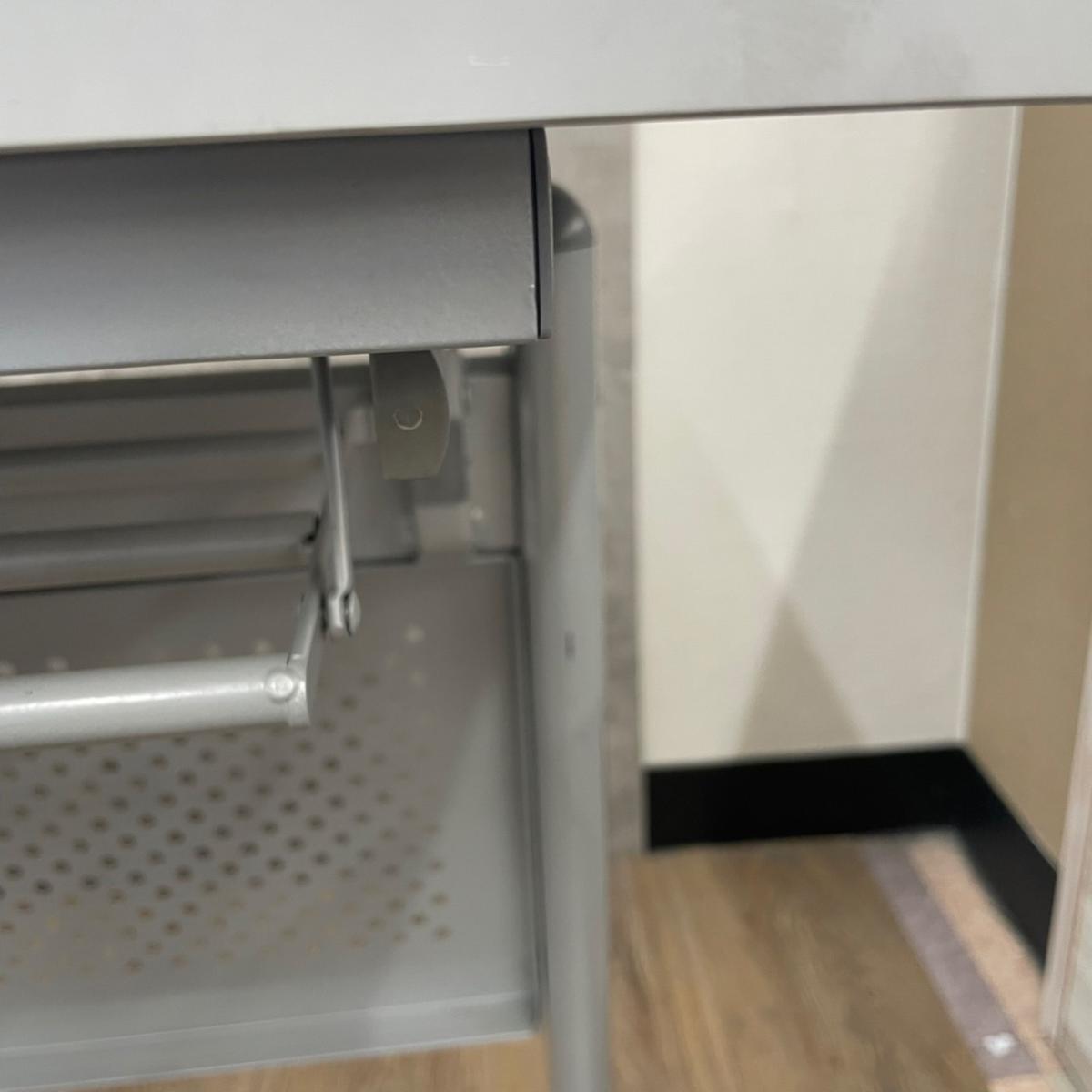 - 一部不具合あり天板歪み、アジャスター無し、キャスター使用不可ようなそのテーブルの本来の効用を果たすための機能以外の一部が使用不可な状態。(例、キャスターロッ ク機能使用不可、棚板無し等がある。)