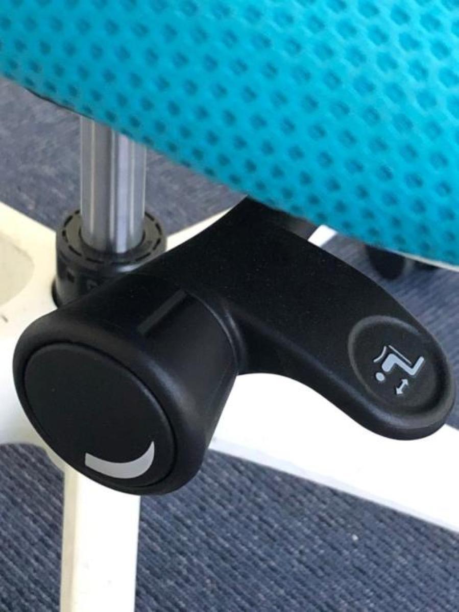 - 座面左下のダイヤルでリクライニングの固定と解除が行えます。 前傾ポジションをとることも可能です。