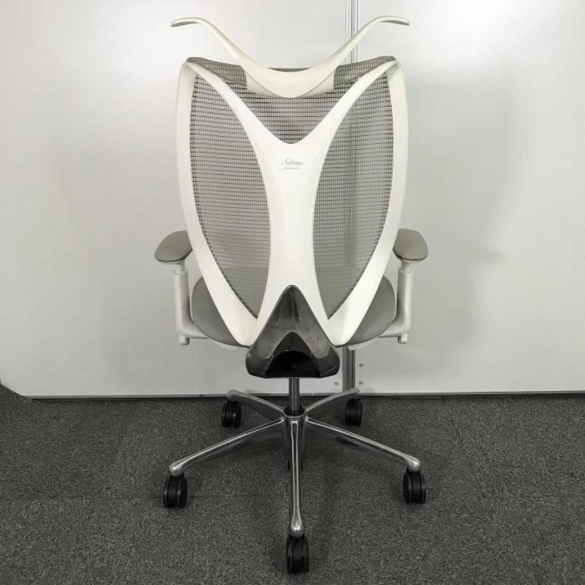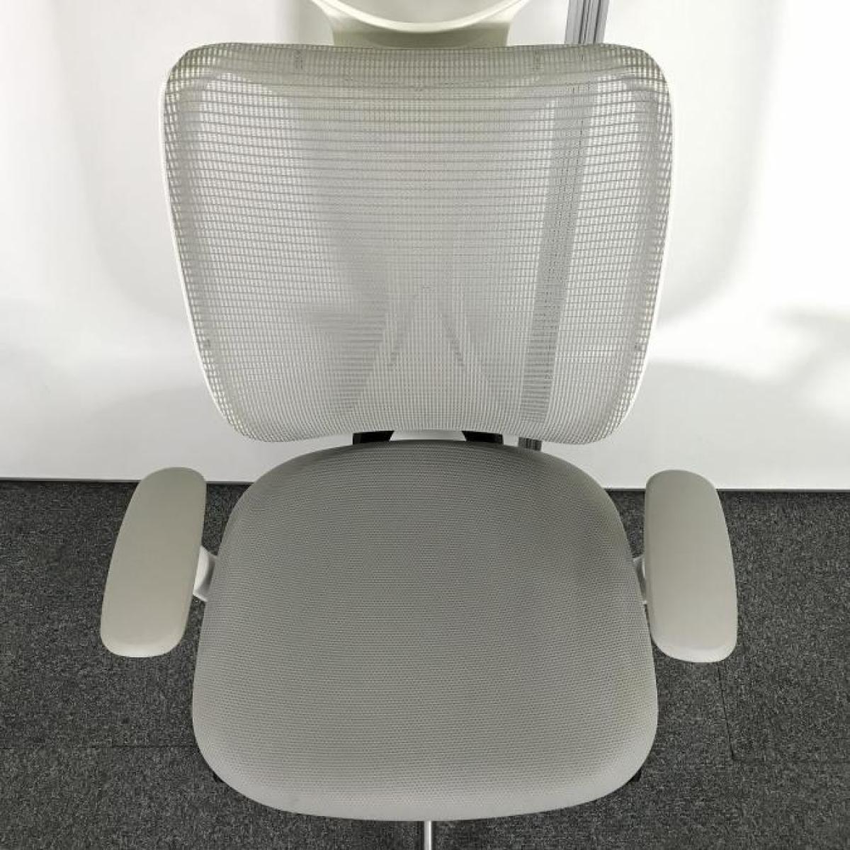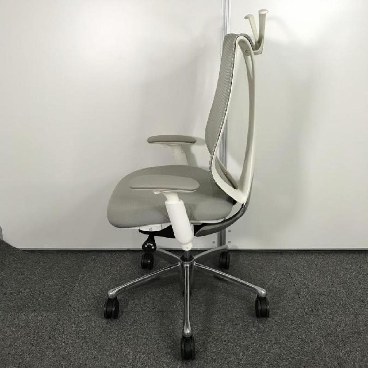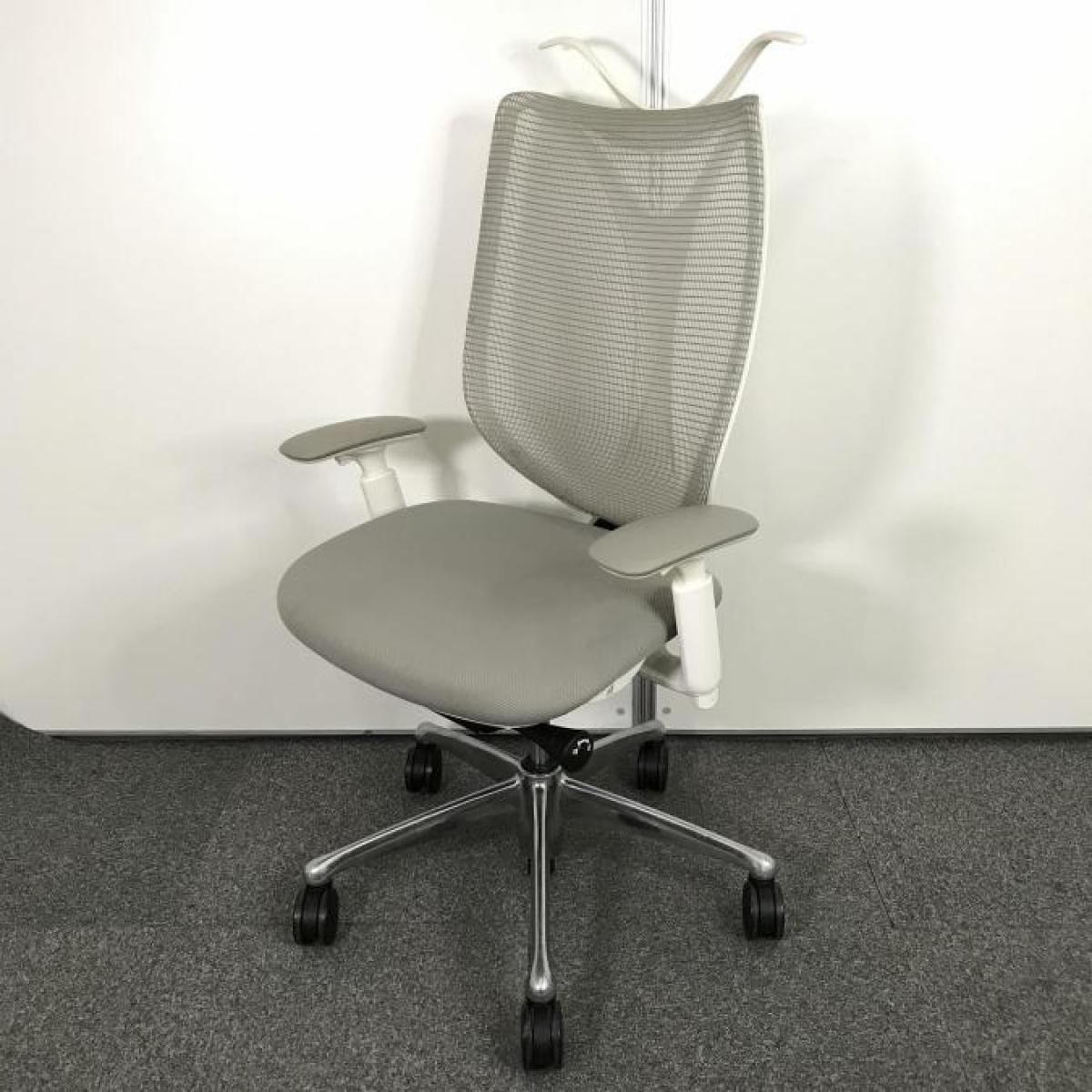 【前傾チルト付!流れるような美しいフォルムの最高級メッシュチェア!】■オカムラ(okamura)製 Sabrina(サブリナ) ハイバック 肘付き ■可動肘 ■背面メッシュ ■ライトグレー × ホワイトフレーム ■ハンガー付き- つくば店