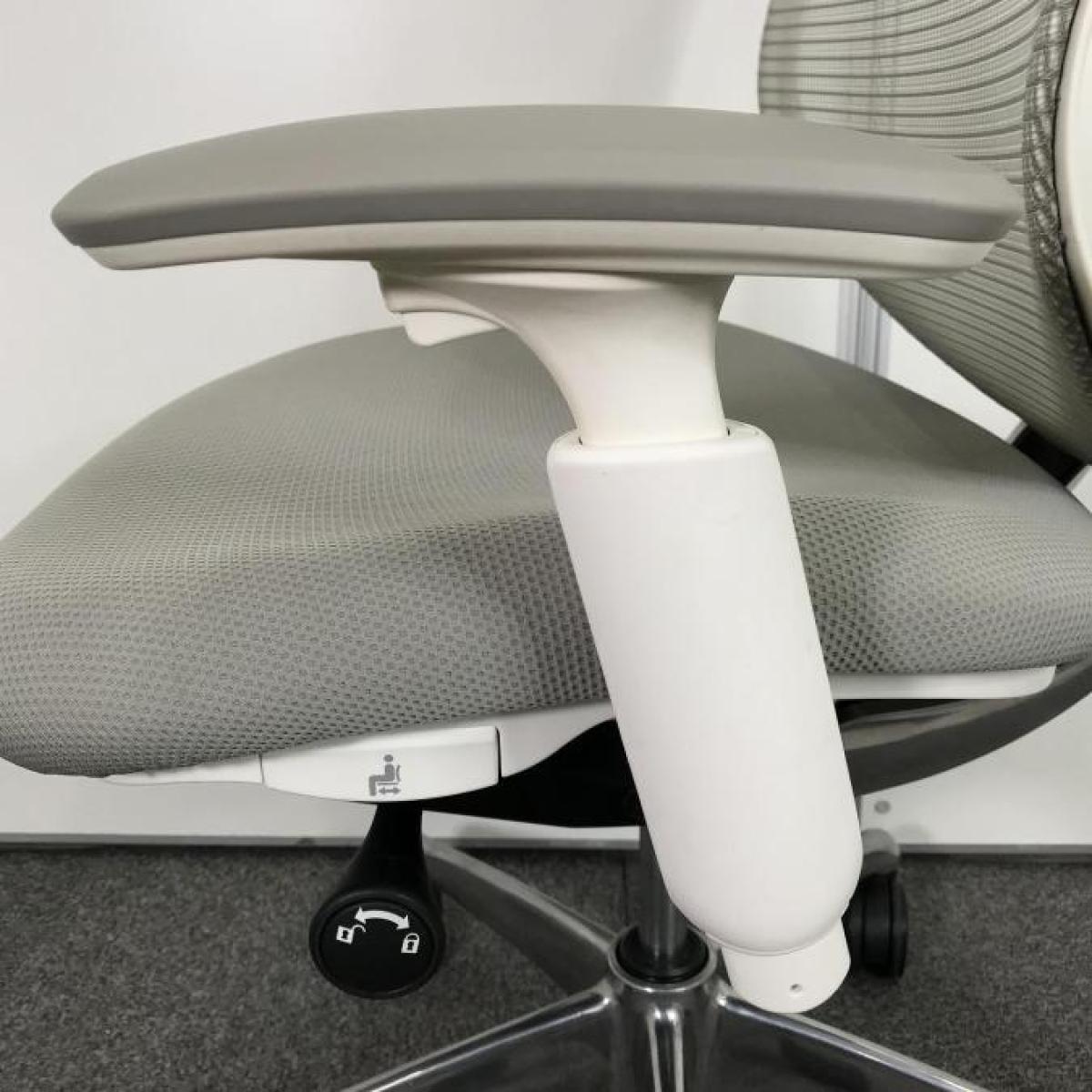 【前傾チルト付!流れるような美しいフォルムの最高級メッシュチェア!】■オカムラ(okamura)製 Sabrina(サブリナ)チェア 肘付ハイバック ■アジャストアーム(可動肘) ■背面メッシュ ■ライトグレー × ホワイトフレーム
