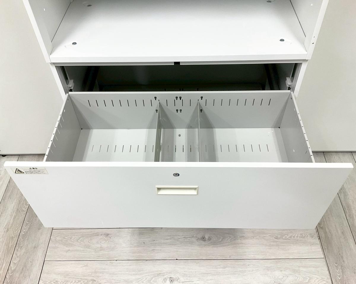 上段が両開き(観音開き)、下段が3段ラテラル(引き出し)書類整理や出し入れに最適な組合せ。