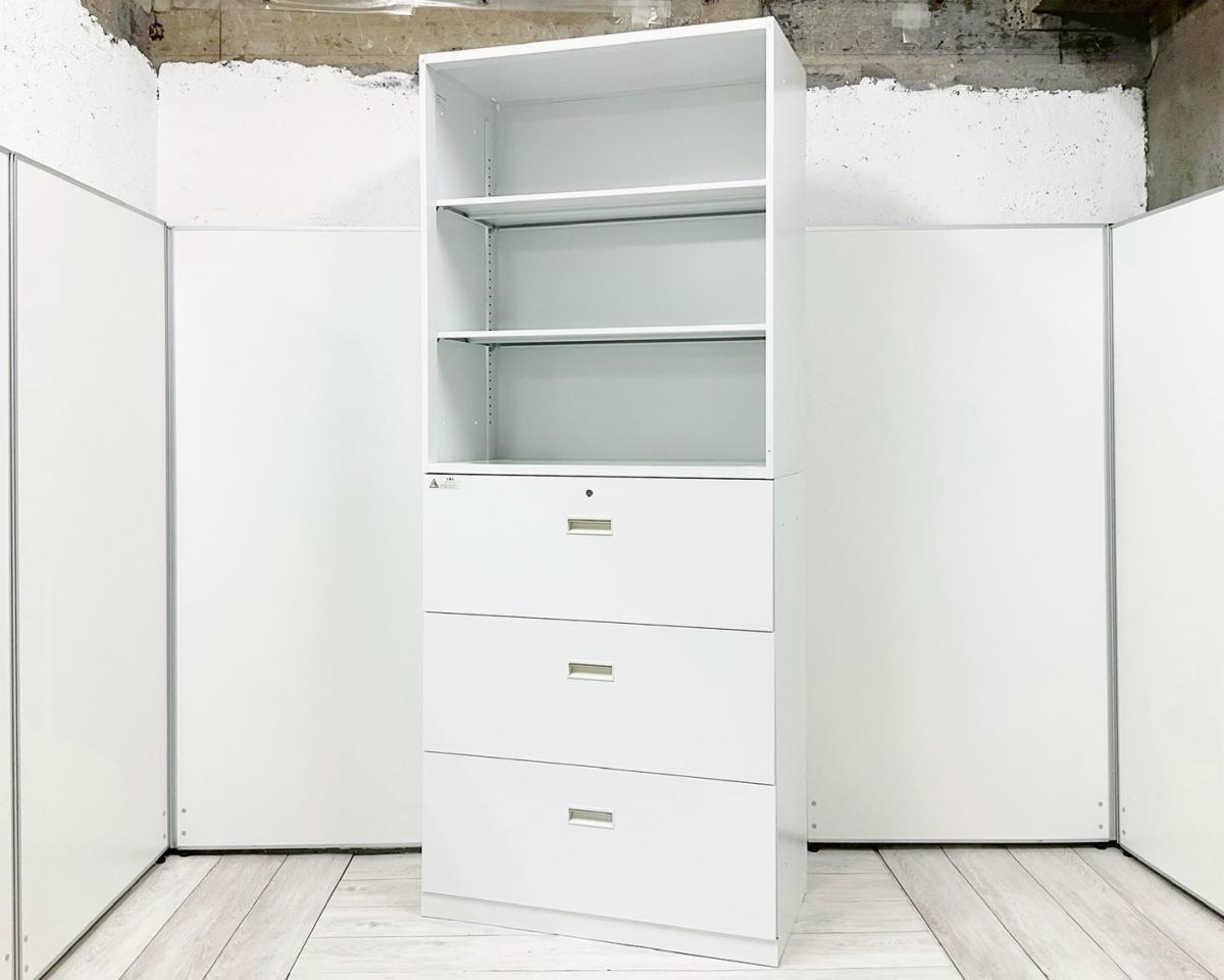 上段が両開き(観音開き)、下段が3段ラテラル(引き出し)書類整理や出し入れに最適な組合せ。