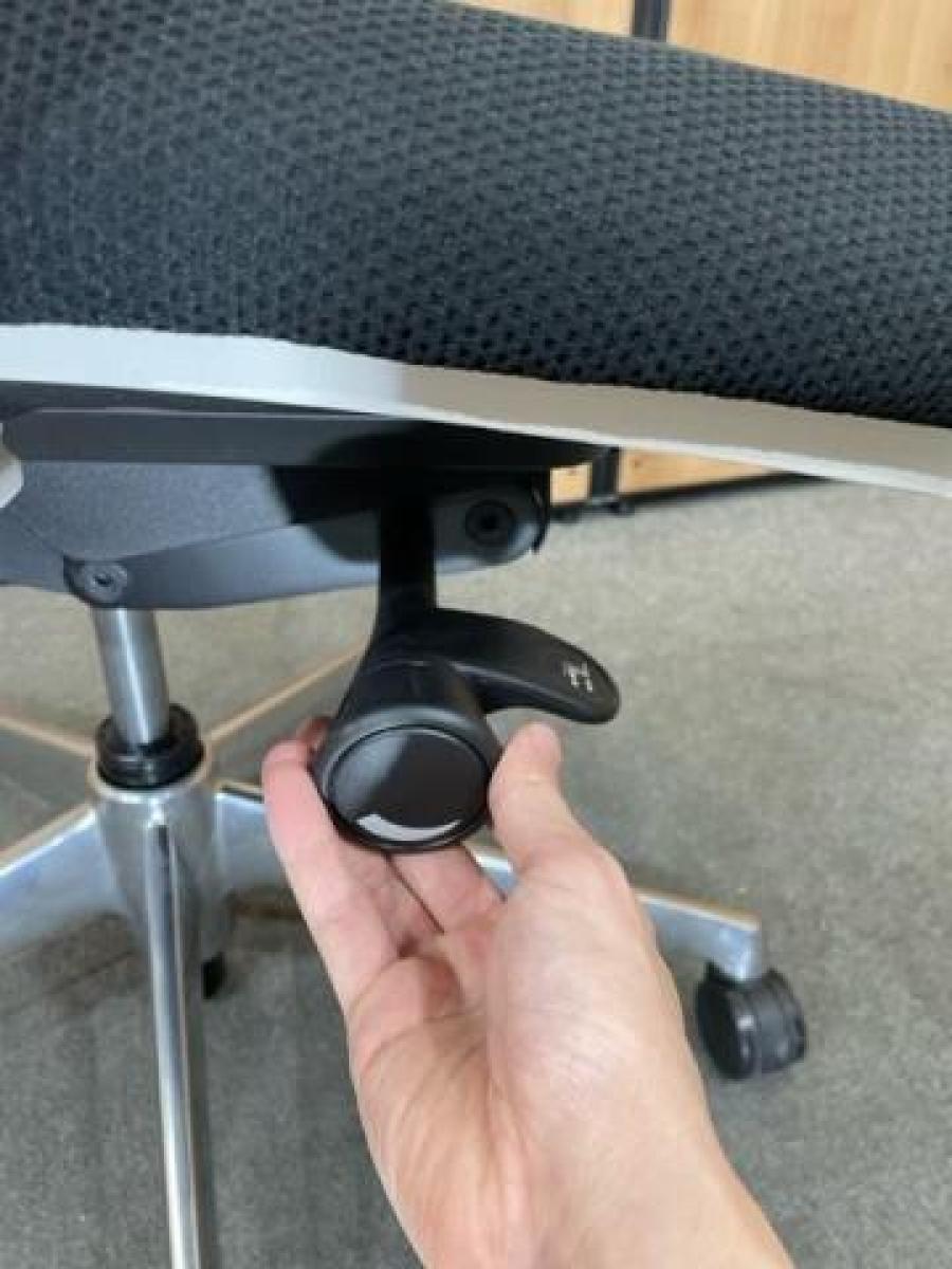 - 座面右下のダイヤル操作で、リクライニングの強弱調整が行えます。これまでのダイヤル式よりも、少ない回転数で、最弱?最強の調整が可能です。