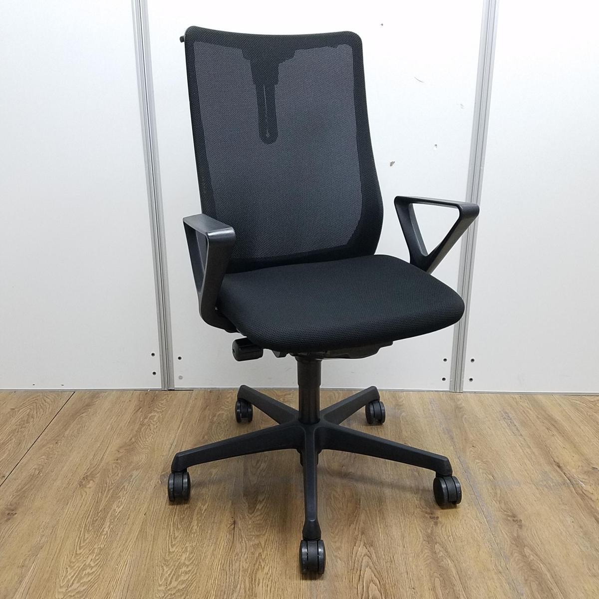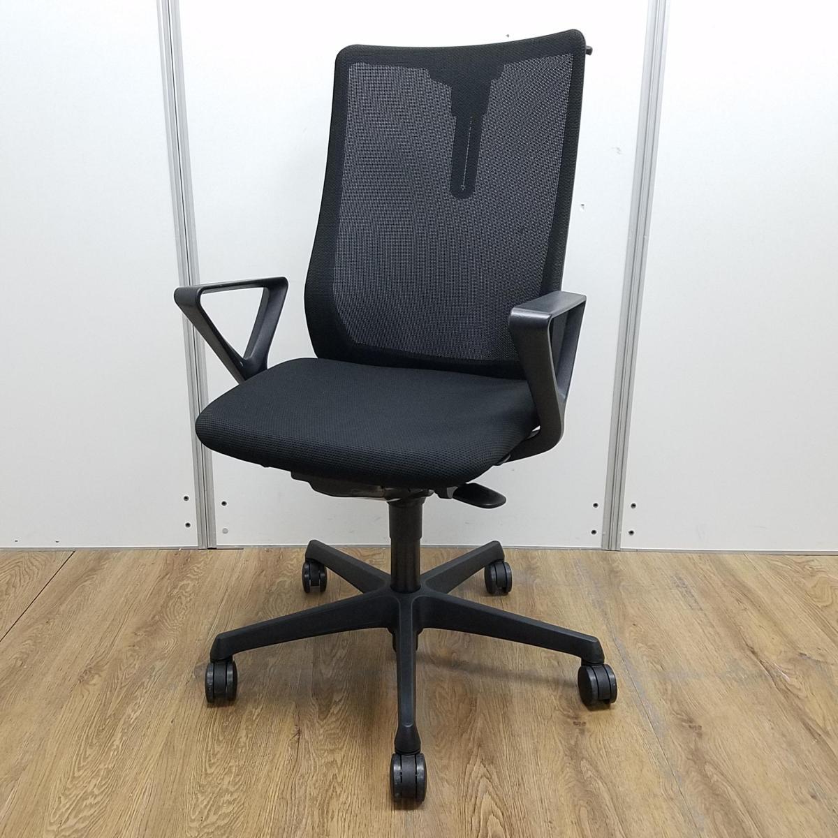 【商品入替のため、残り1脚限り】オカムラ製 フルーエントシリーズ 人気のブラックカラー デザインアーム※固定肘 コートハンガー メッシュ 肘付きハイバックチェア!!- 京都東寺店