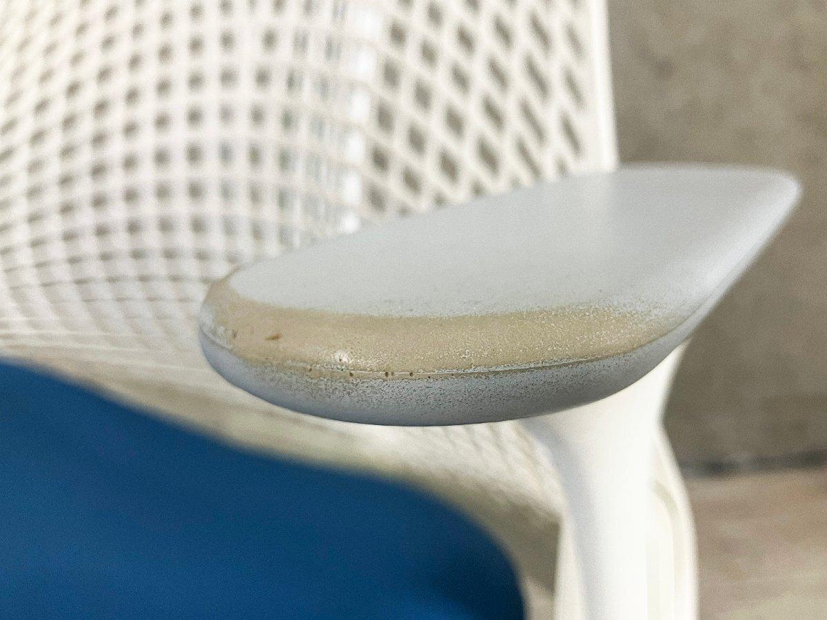 - かなり強い濃い黄ばみ・変色が商品全体にある。(例、座面・背もたれ、脚部等にある。)