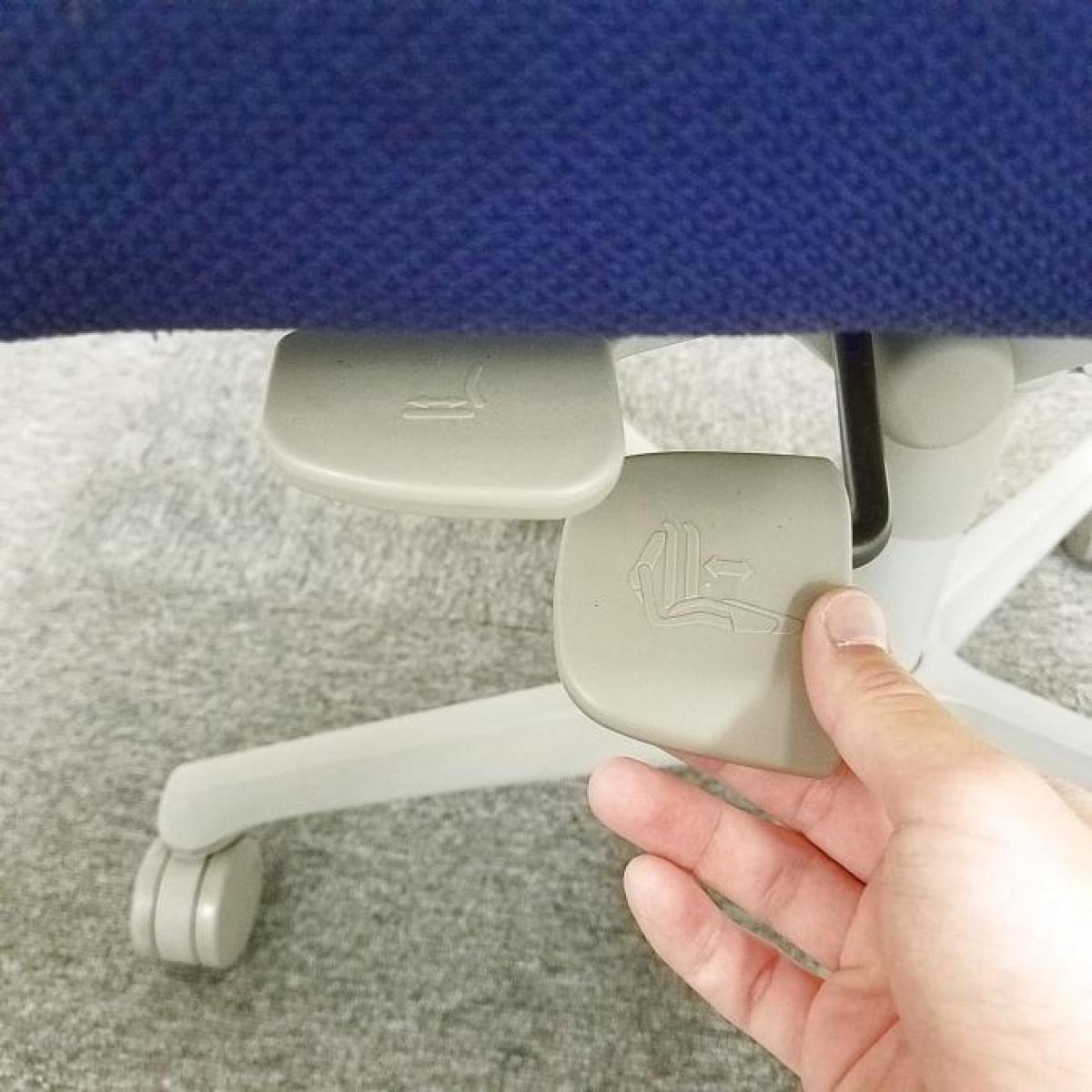 座面の左下にあるレバー操作で座面位置の上下調整(92mm、無段階)が可能です。