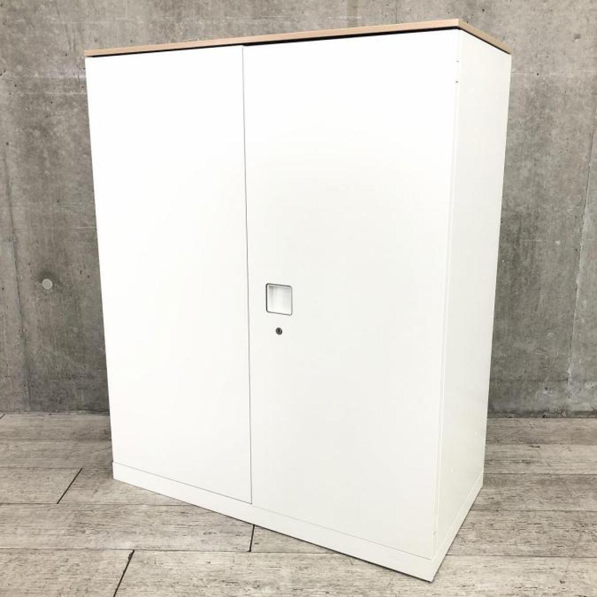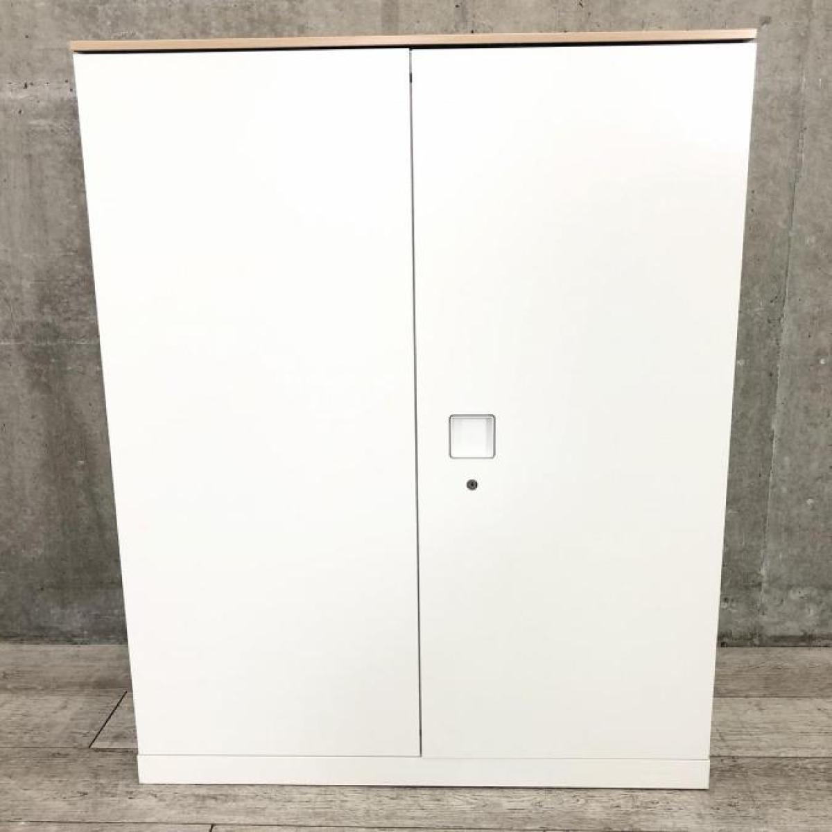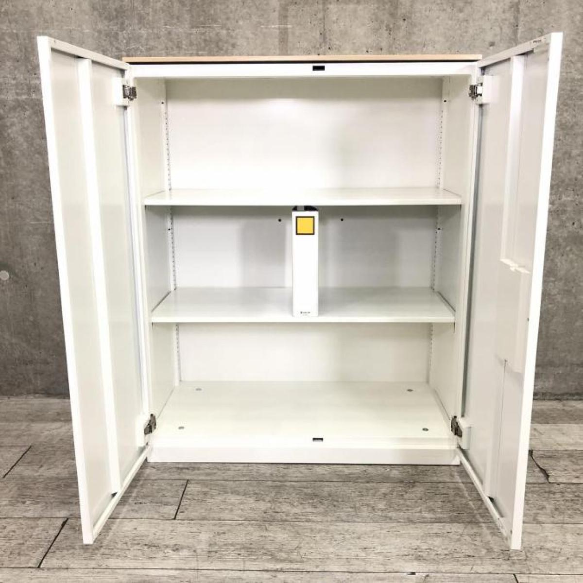 【オフィスの書類をスッキリ整理!取っ手がどの方向からでも開くマルチハンドル!】■オカムラ(okamura)製 レクトラインシリーズ 両開き書庫 ローキャビネット ■本体色:ホワイト ■シリンダー錠 ■ナチュラル天板付き