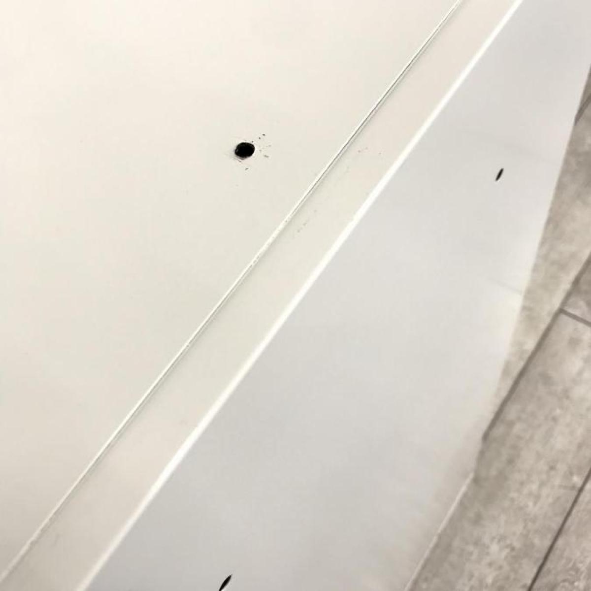- 目立つ箇所複数あり深い傷・凹みが商品全体にある。(例、天板、正面、背部、サイド部分にある。)