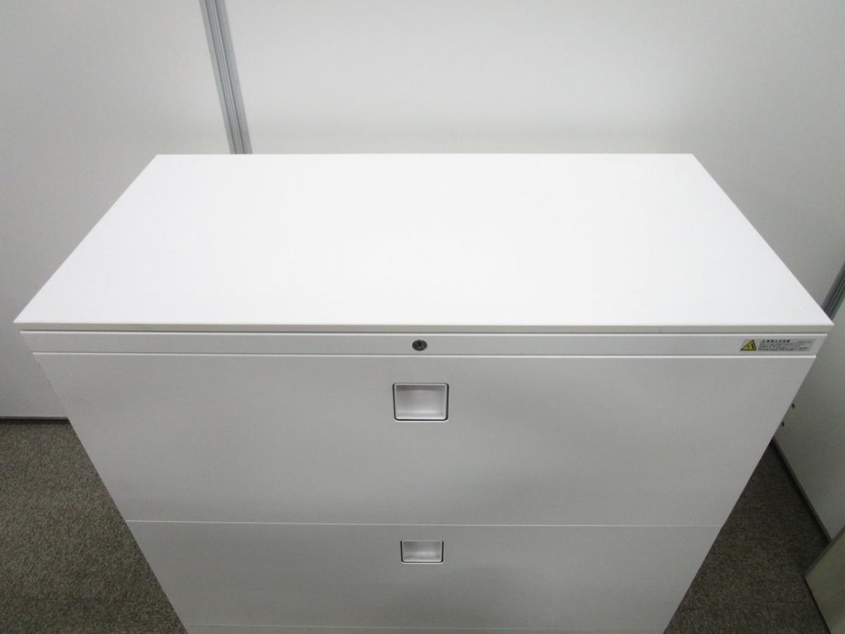 オカムラ レクトライン 3段ラテラル書庫 ホワイト天板 シリンダー錠 鍵付き ※取っ手部分に若干日焼けあり