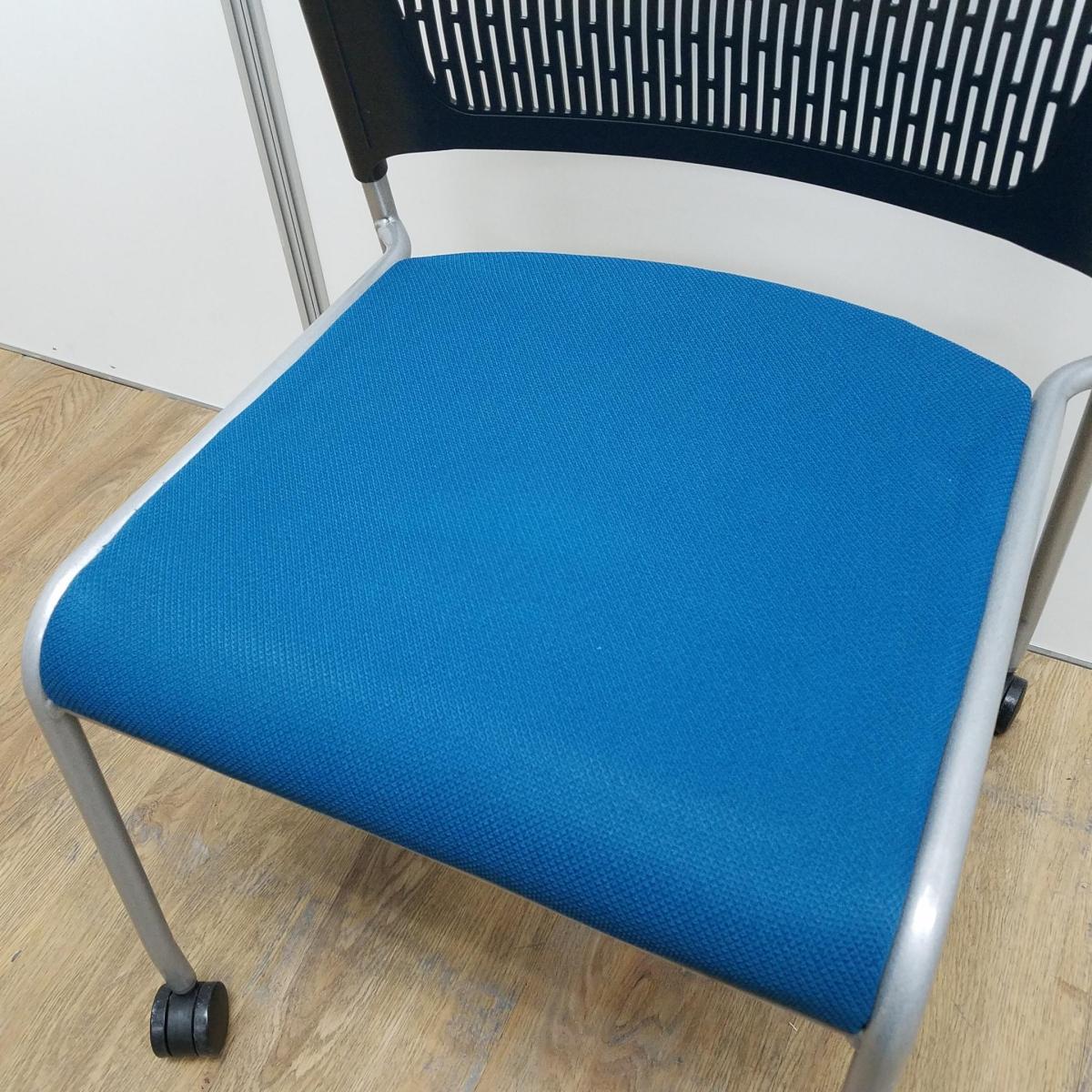 【重ねて収納可能!さわやかなカラーとシンプルデザイン!】■オカムラ製 レーテ スタッキングチェア ミーティングチェア ■キャスター付き ■座面ブルー×背面ホワイト【2412】弊社使用欄【A00990049】