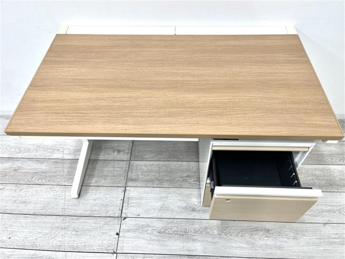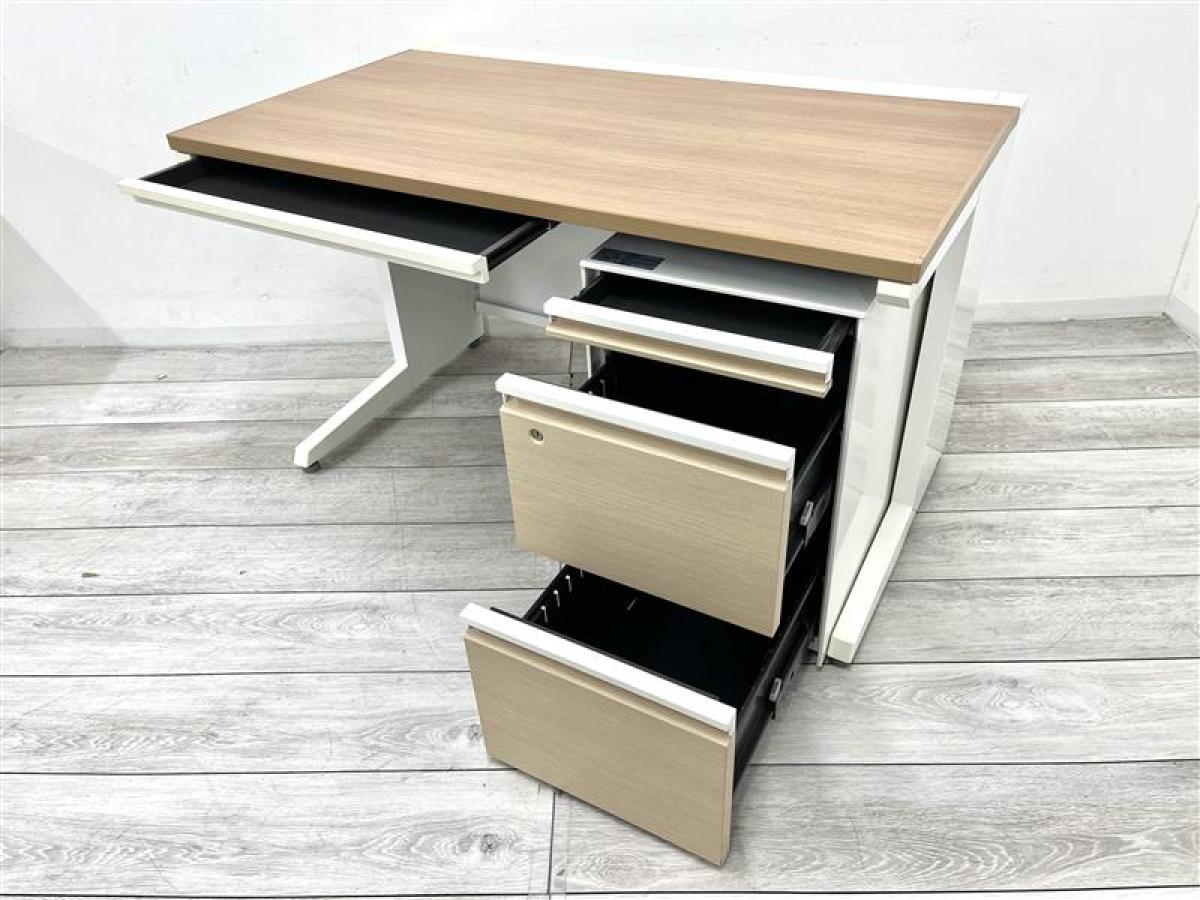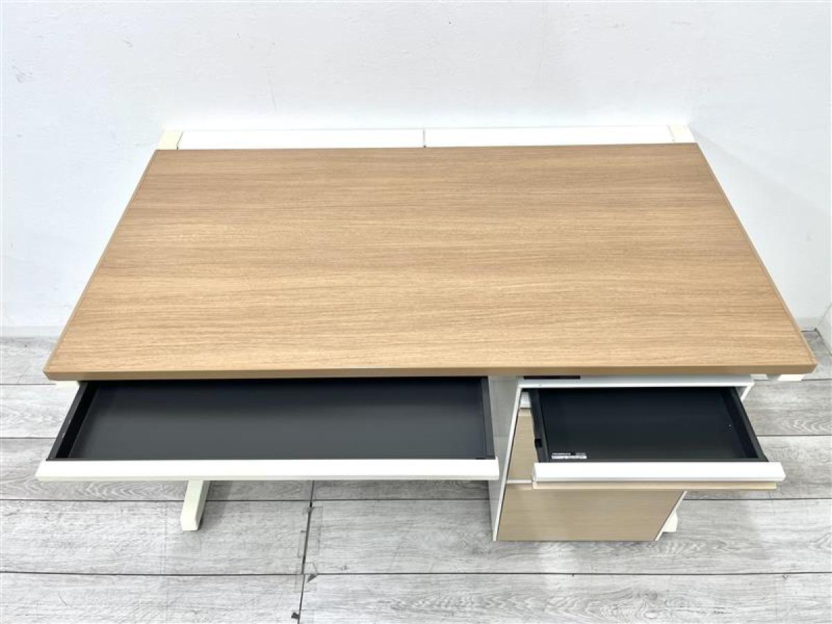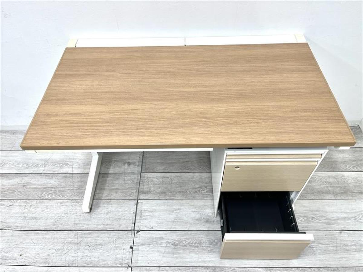 【定価約9万円】【ワイヤリング機能が充実!清潔感のあるホワイトカラーにおしゃれなナチュラル天板の平机!】■オカムラ(okamura)製 アドバンスシリーズ(ADVANCE) 平机 引き出し付き 幅1200㎜ ■天板:ナチュラル / 本体:ホワイト 【弊社使用欄:A01023578】【SN】