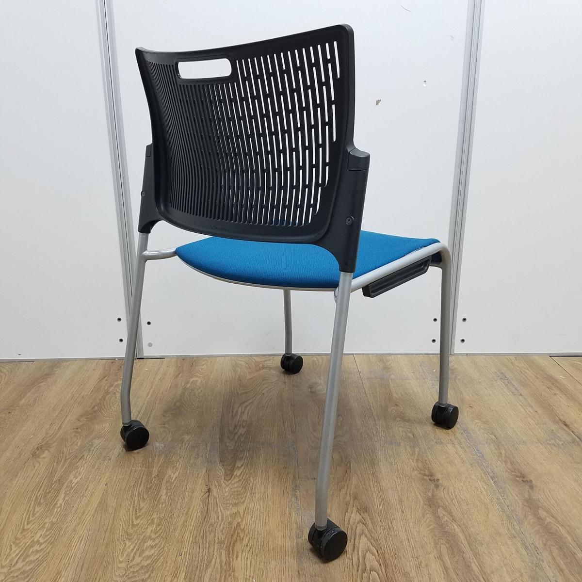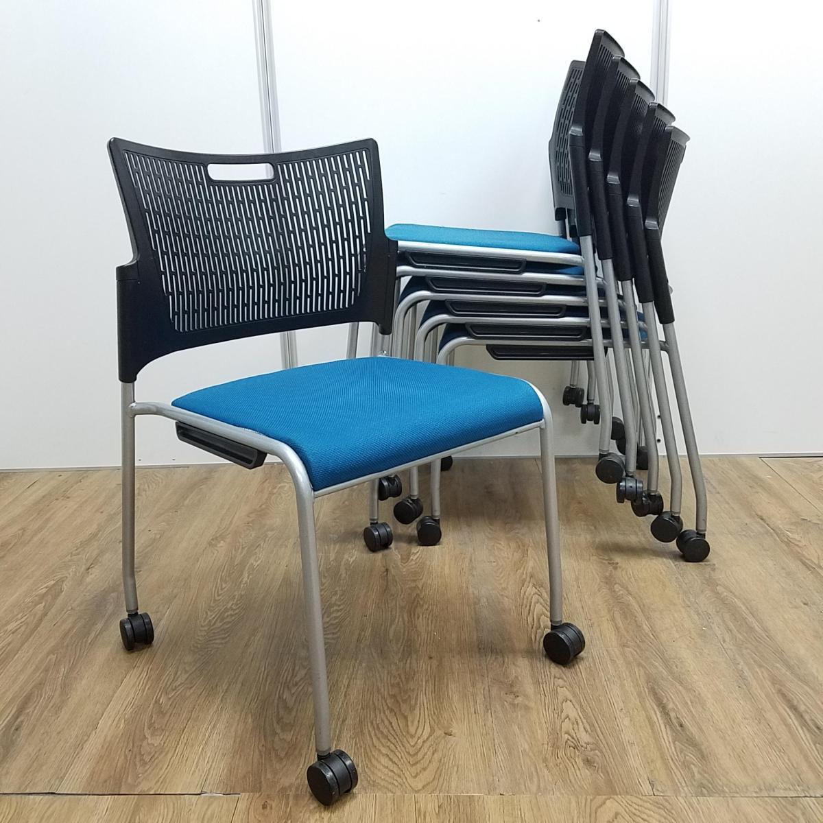 【シンプルなデザインで使いやすい!重ねて収納可能なスタッキングチェア!会議室、共有スペースなどに!】■オカムラ(okamura)製 レーテ(RETE) スタッキングチェア ■背:ブラック樹脂メッシュタイプ 座:ターコイズブルー ■キャスター付き- 新大阪店
