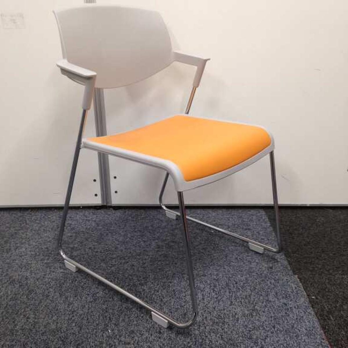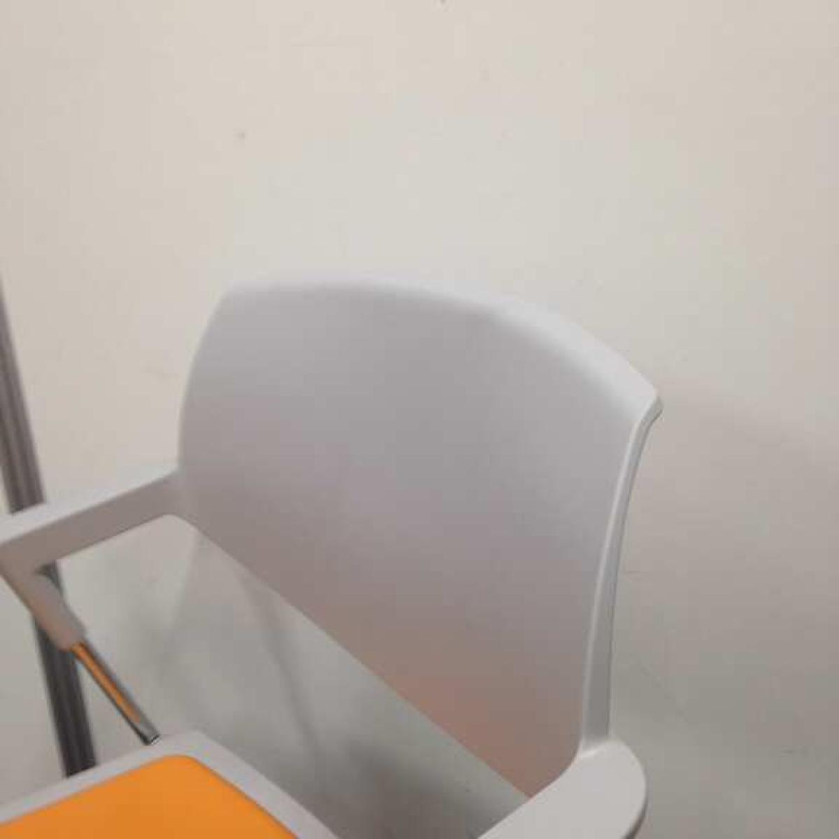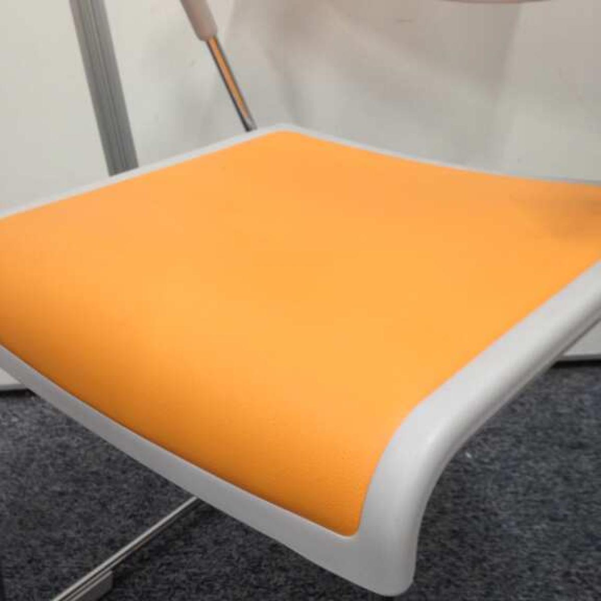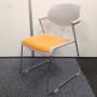 【肘一体型のシェルが身体への負担を軽減!】■コクヨ(KOKUYO)製 サティオシリーズ スタッキングチェア 肘付 ■固定肘 ■背面:グレーシェル/座面ビニール:タンジェリンオレンジ- 新大阪店