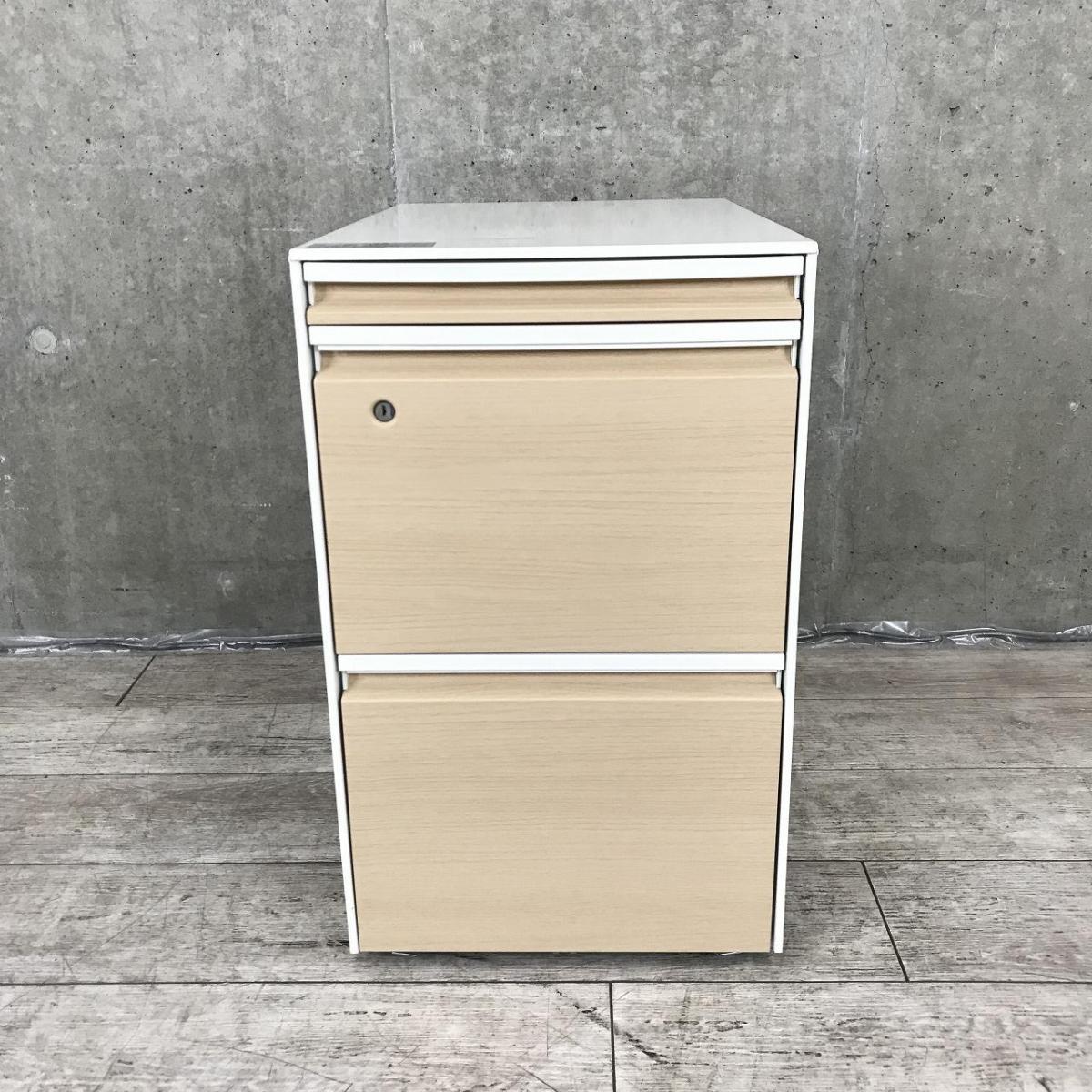 【珍しい表面ナチュラル木目調のおしゃれなワゴン!】■オカムラ(okamura) プロステージクレストシリーズ 3段ワゴン H640㎜ ■色:本体/ホワイト 正面/木目調ナチュラル ■シリンダー錠 【平机・フリーアドレスデスクのお供に!】- 千葉店