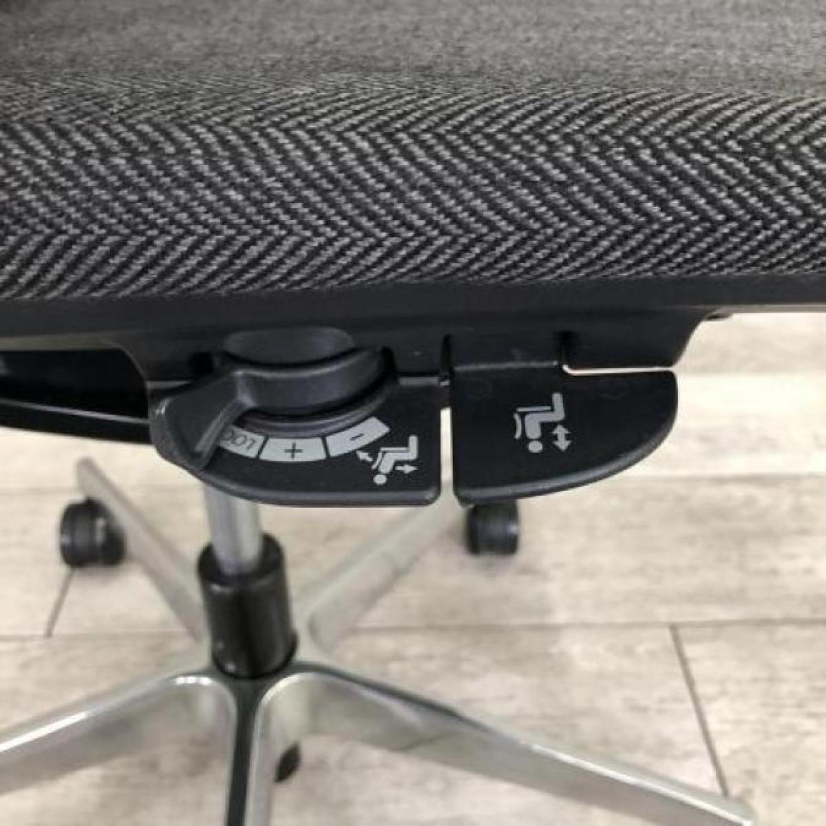 - 座面の高さ調節や背と座がシンクロしてスライドするアンクルチルトリクライニングなど、基本的な調節機能を搭載。