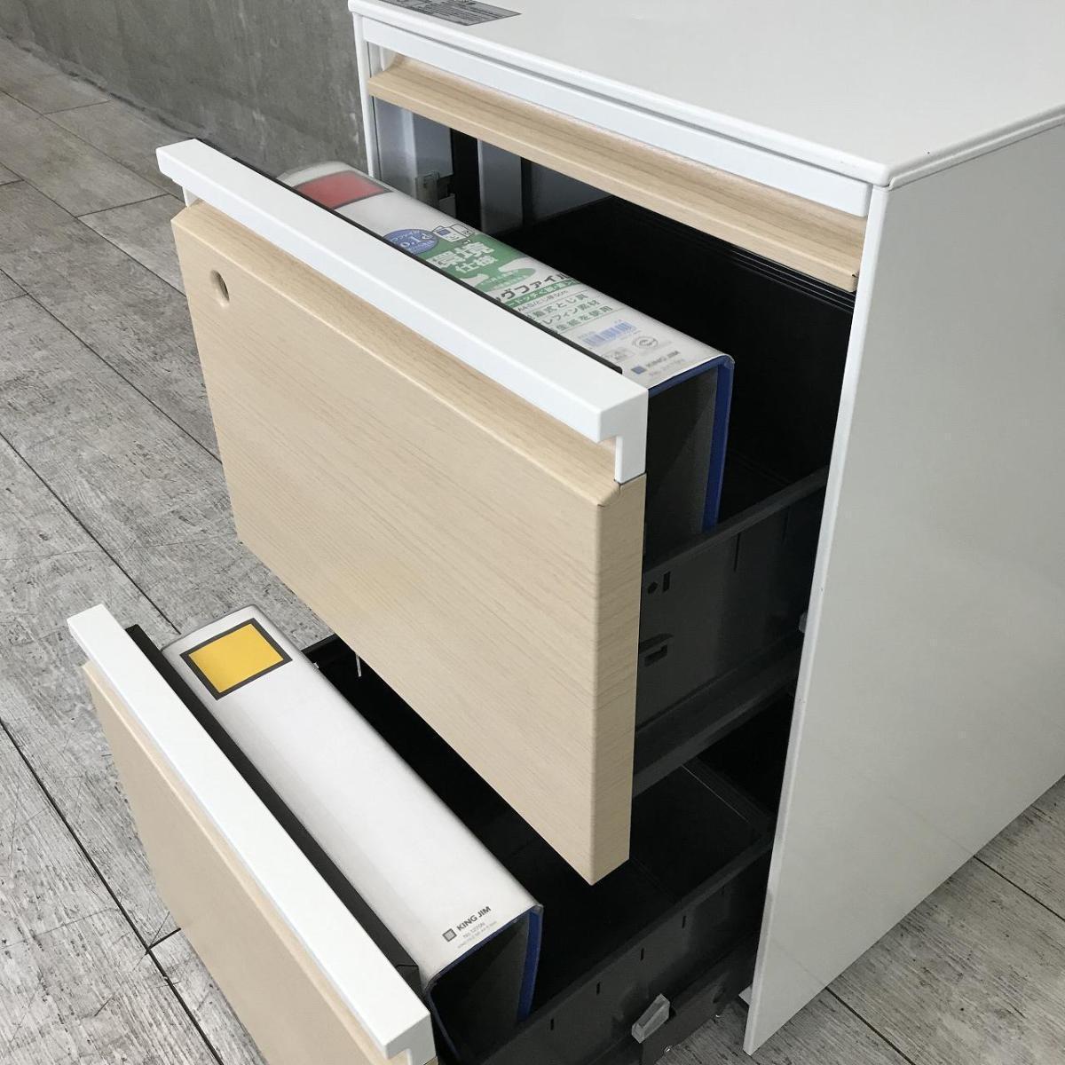 【木目調で上質なデザイン!】■オカムラ製 3段ワゴン H640㎜ 色:引出し/ネオウッドライト 本体/ネオホワイト シリンダー錠 ■※キャスターの動きが鈍いためお安く!【PROSTAGE CREST】【ハイワゴン】【A01023570】- 川崎店