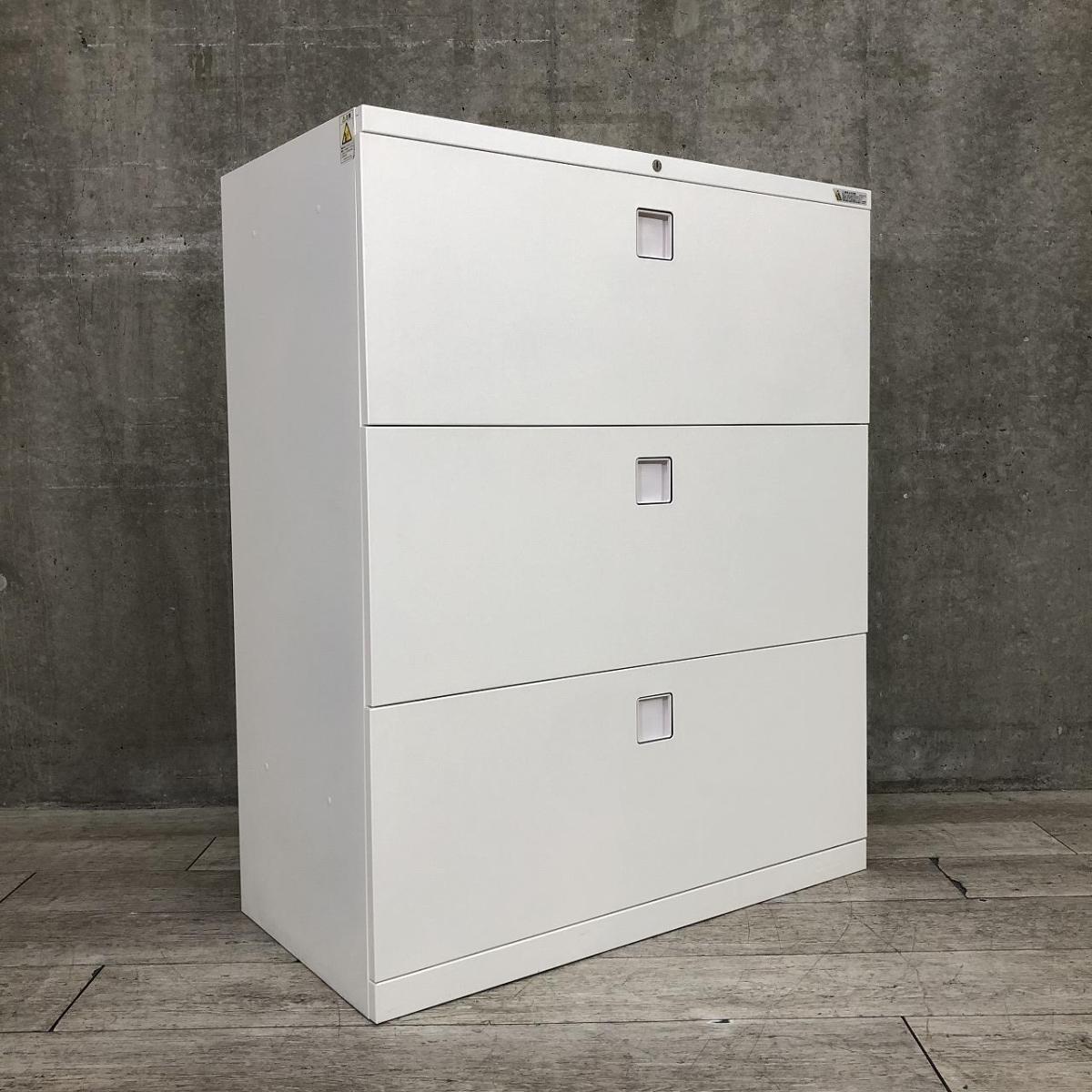 【ファイル収納にオススメ!高品質で使いやすい人気シリーズの3段ラテラル書庫!】■オカムラ(okamura)製 レクトラインシリーズ 3段ラテラル書庫 ローキャビネット H1100㎜ ■ホワイト ■シリンダー鍵 ■天板付き(天板:ホワイト) ※日焼け有