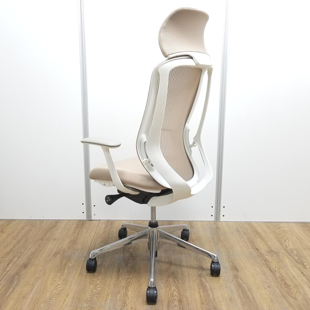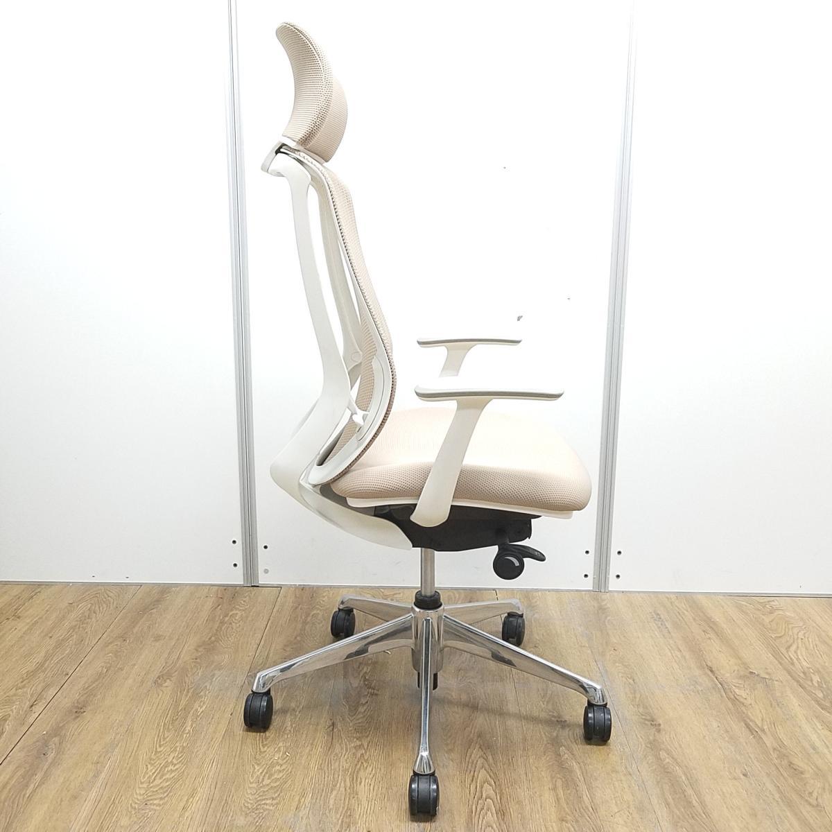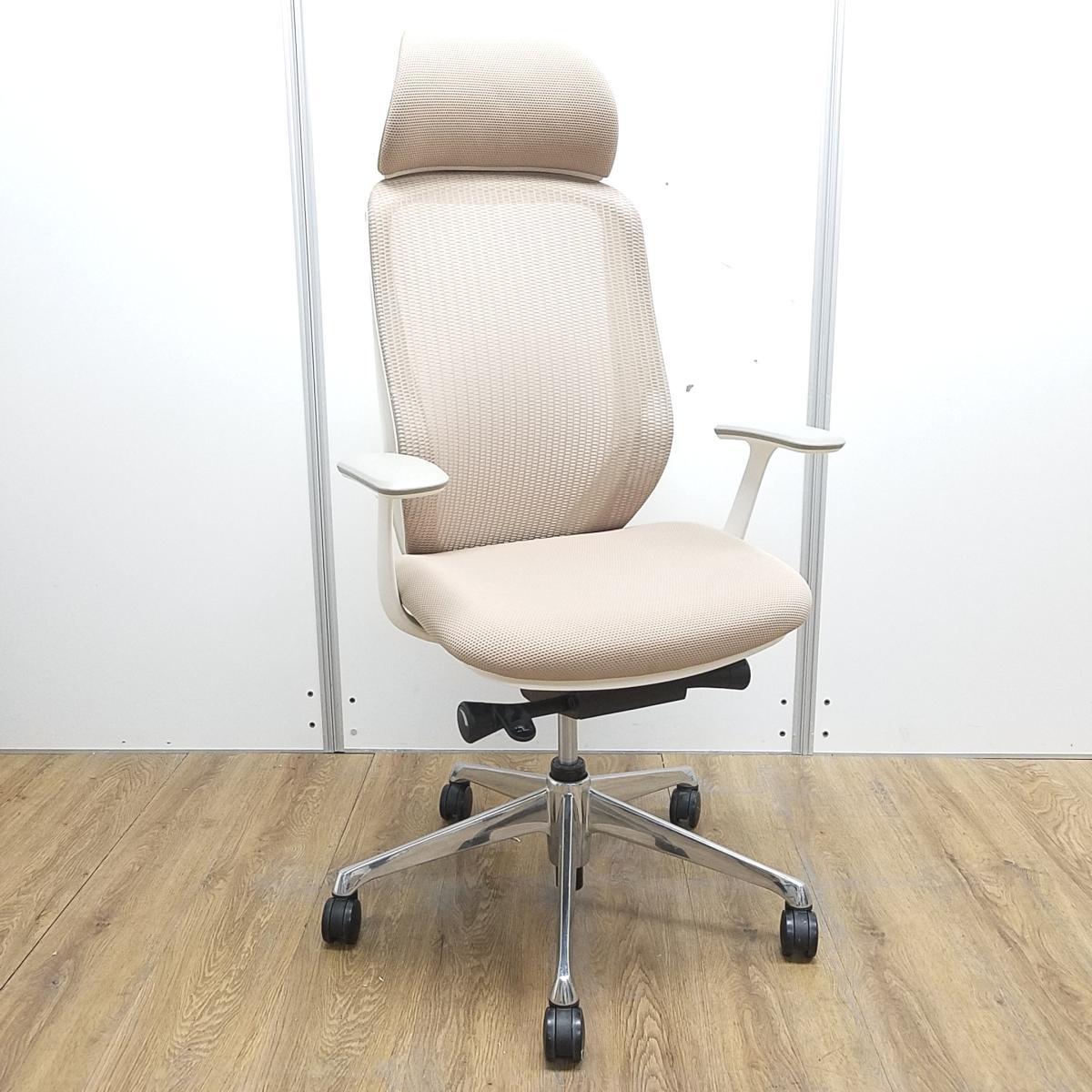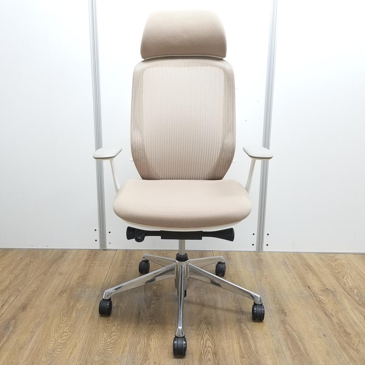 オカムラ製 シルフィシリーズ ベージュ 背もたれメッシュ デザインアーム※固定肘 ポリッシュ脚 ヘッドレスト付き 前傾チルト機能付き オカムラ製品で最も人気を集める高機能メッシュチェア! 肘付きハイバックチェア!!- 京都東寺店