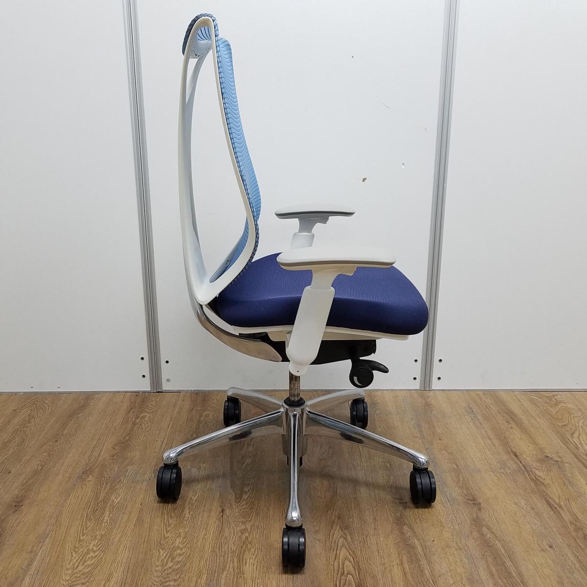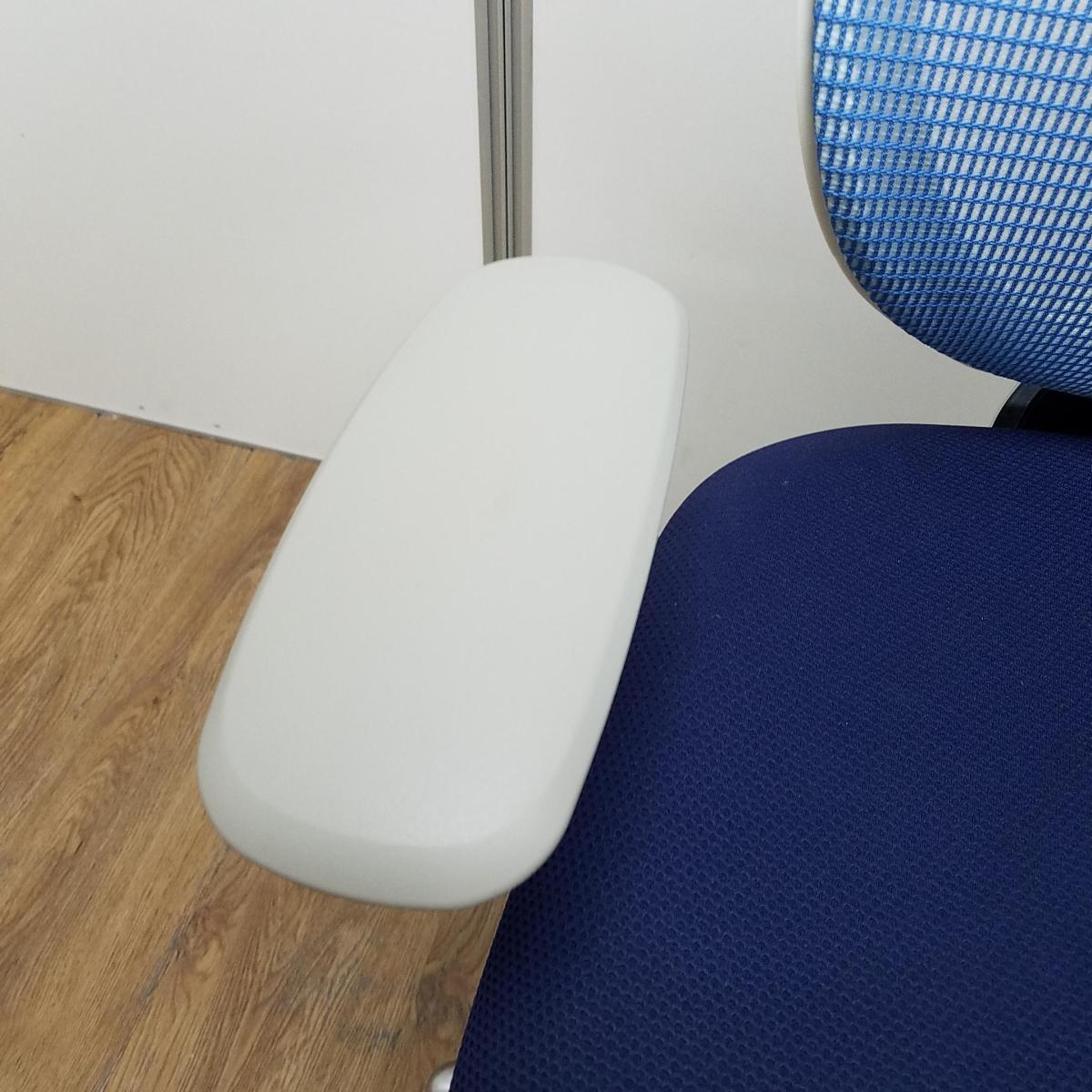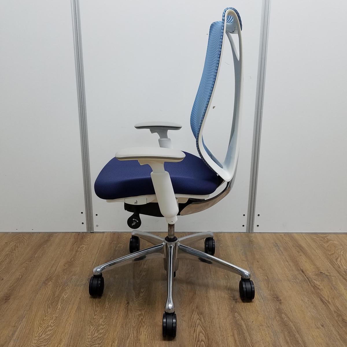 オカムラ製 サブリナシリーズ アクアブルー 背もたれ/アクアブルーx座面/ダークブルーのツートンカラー ホワイトフレーム アジャストアーム※可動肘 前傾チルト付 流れるような美しいフォルムの最高級メッシュチェア! 肘付きハイバックチェア!!【個】- 京都東寺店