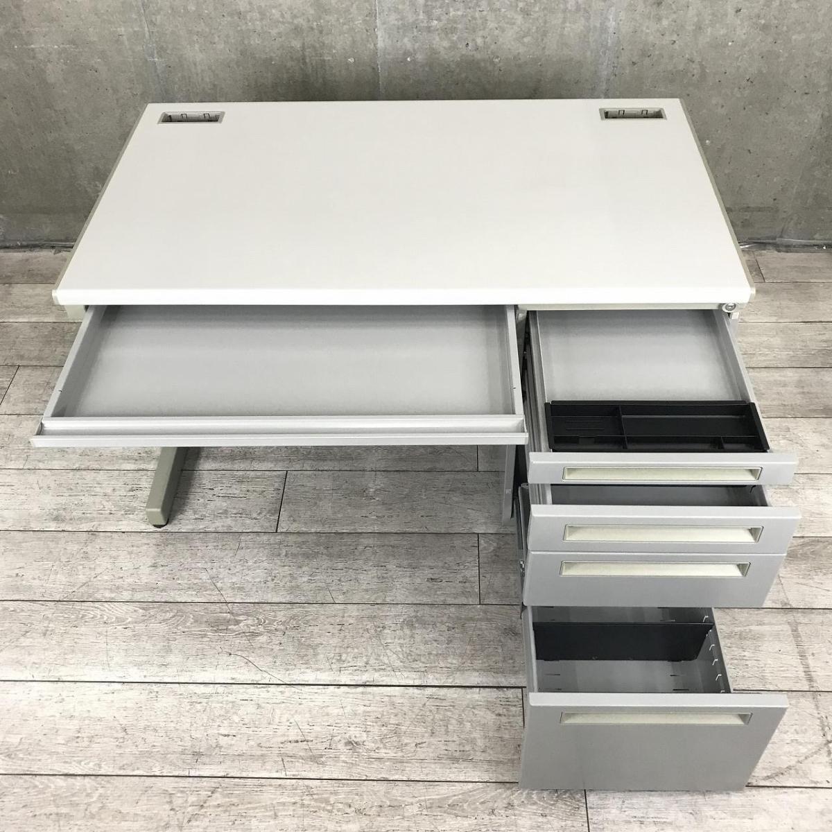 【人気の定番サイズ!使い勝手が良く耐久性に優れた片袖机が入荷!!】■内田洋行(UCHIDA)製 FEED-Nシリーズ 片袖机 袖4段 W1200㎜×D700㎜ ■配線口付(配線タップ欠品) ■シリンダー錠 ■グレー ※日焼け有- なんば日本橋店