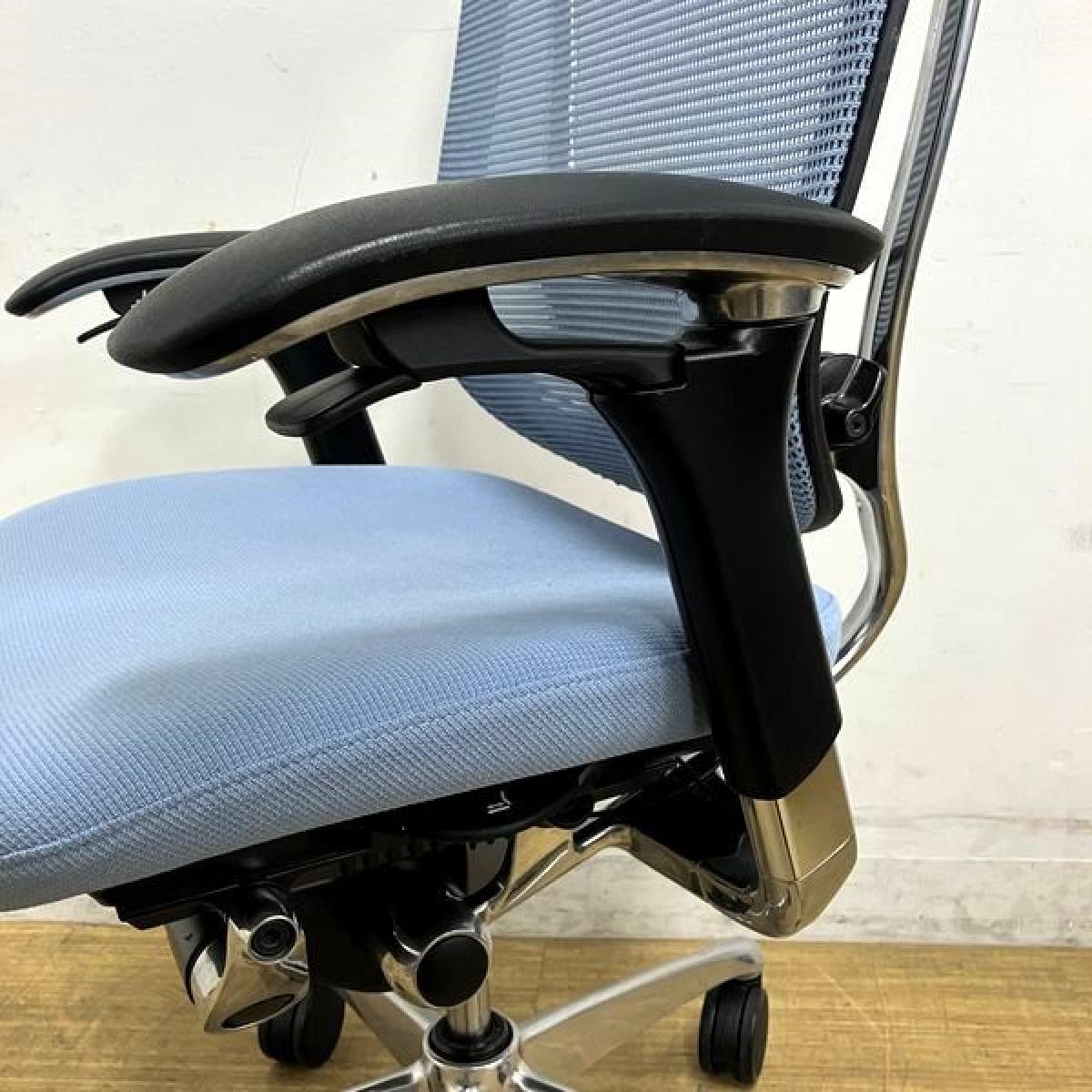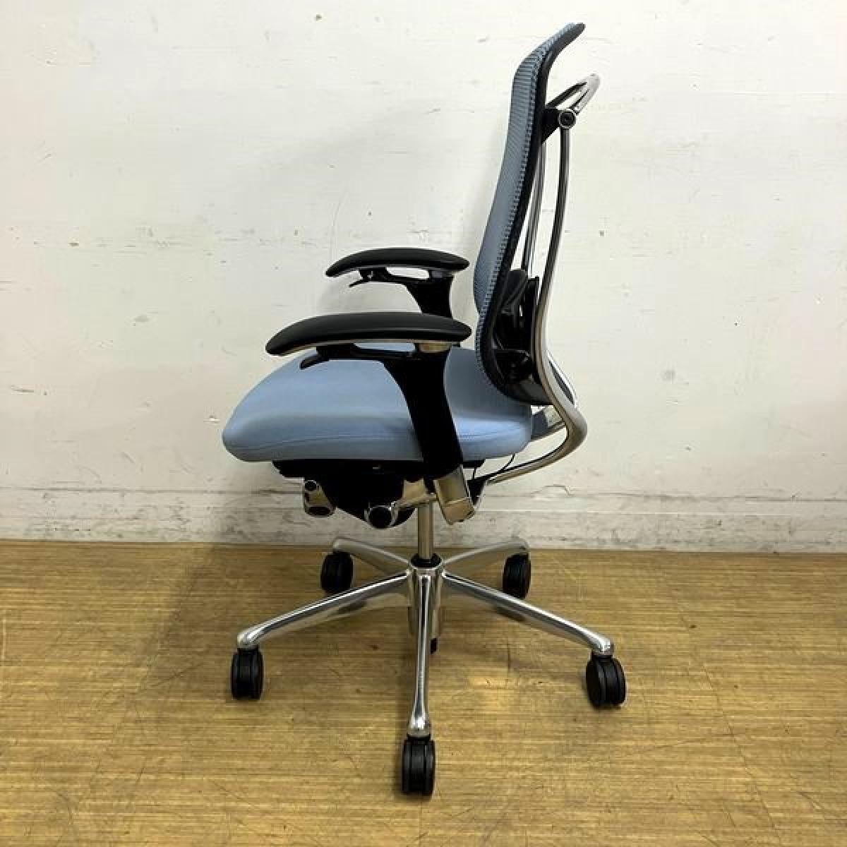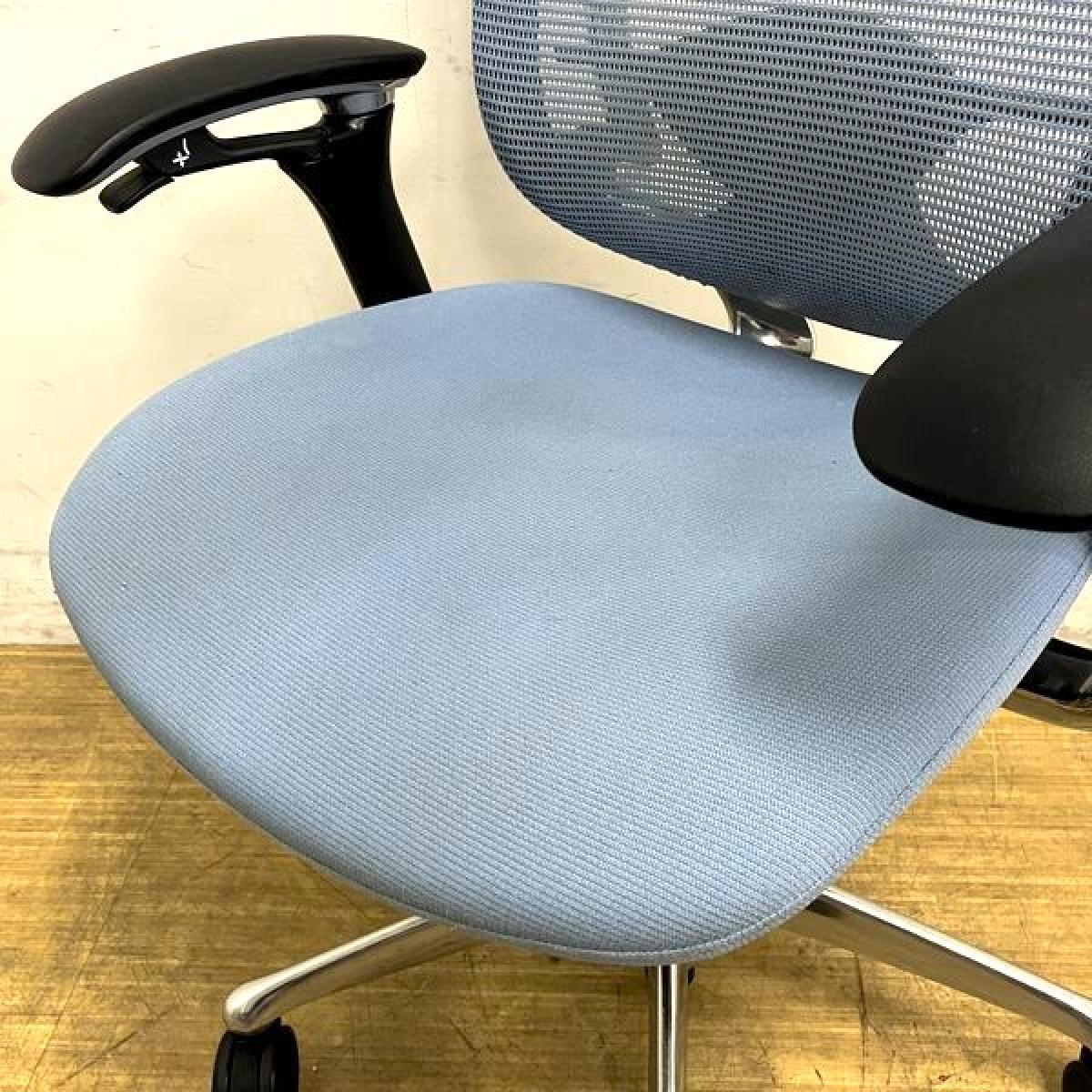 【K9】【商品入替のため、残り7脚限り】【座面に使用感の汚れあり】オカムラ製 コンテッサシリーズ ライトブルー 背面メッシュ ランバーサポート付 可動肘 世界で認められた革新的タスクチェア! 人間工学に基づいた快適な座り心地を実現! 肘付きハイバックチェア!!