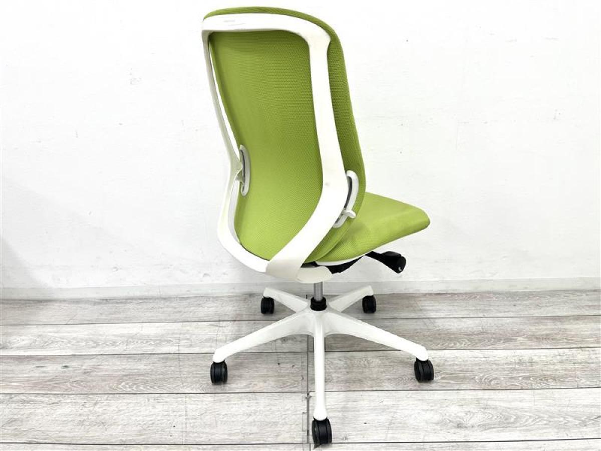 オカムラ製 シルフィーシリーズ ライムグリーン ホワイトフレーム 背面クッション コートハンガー付き 快適な座り心地を実現! 人気シリーズの背面クッションモデル! 肘無しハイバックチェア!!