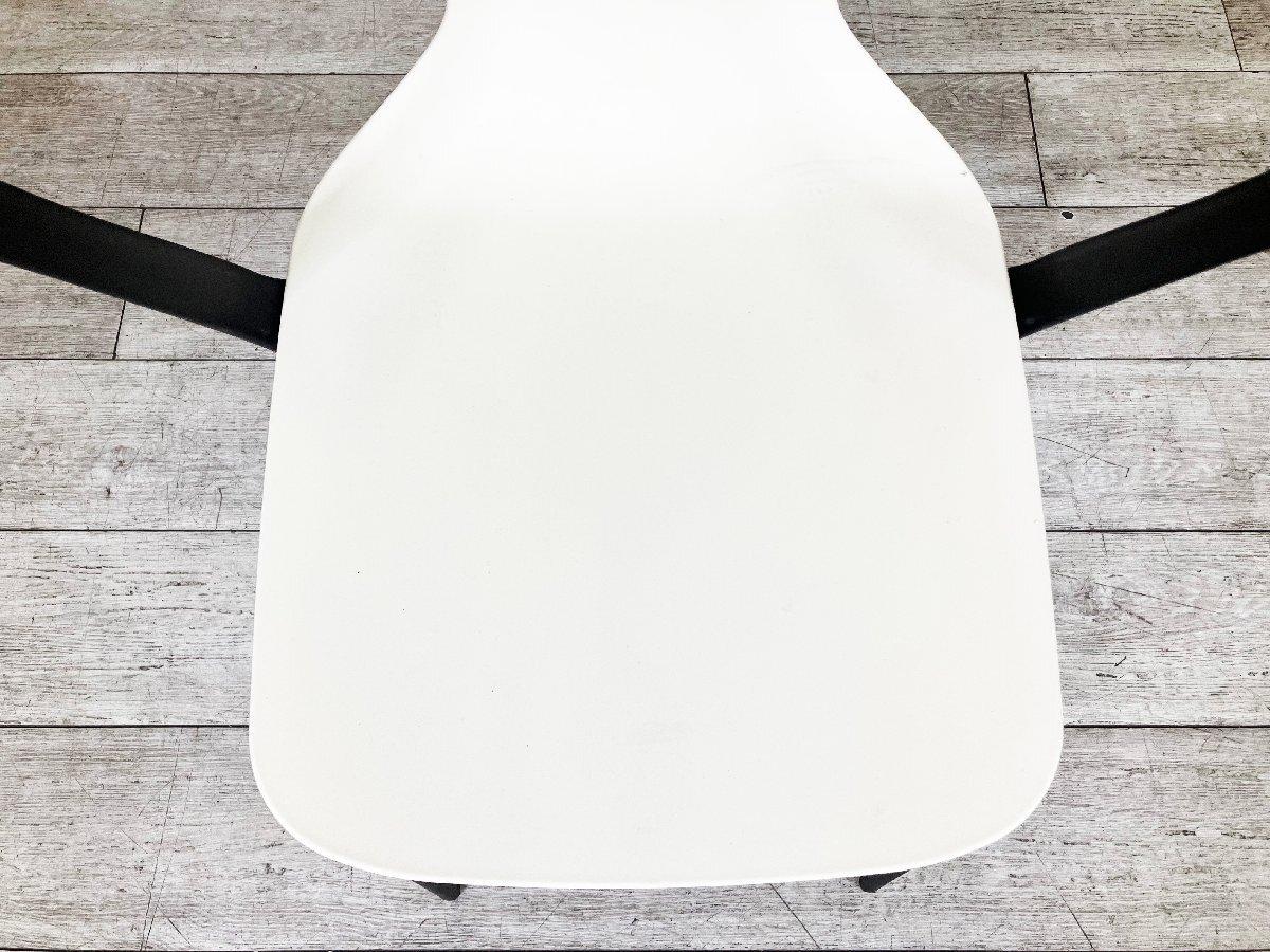 この椅子の最大の特徴はシートシェルです。シートシェルは、ベルヴィルチェアのアイデンティティとなる部分であり、素材や色に応じてイメージが変化します。スレンダーな黒のフレームは、脚や背面に向かって書道の線を思わせるようなラインを描いています。一方シートシェルは、広めの座面が背もたれにかけて細くなっていき、非常に薄いシェルを支えています。